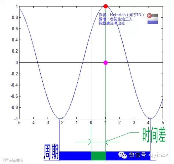 这里需要纠正一个概念:时间差并不是相位差。如果将全部周期看作2Pi或者360度的话,相位差则是时间差在一个周期中所占的比例。我们将时间差除周期再乘2Pi,就得到了相位差。