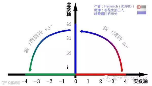 同时,我们获得了一个垂直的虚数轴。实数轴与虚数轴共同构成了一个复数的平面,也称复平面。这样我们就了解到,乘虚数i的一个功能——旋转。