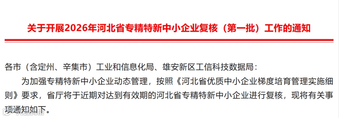 以下为解读文件内容:为加强专精特新中小企业动态管理,落实优质中小企业梯度培育要求,河北省工业和信息化厅发布通知,正式开展 2026 年第一批专精特新中小企业复核工作,通过规范审核、严格把关,持续提升全省专精特新企业发展质量。