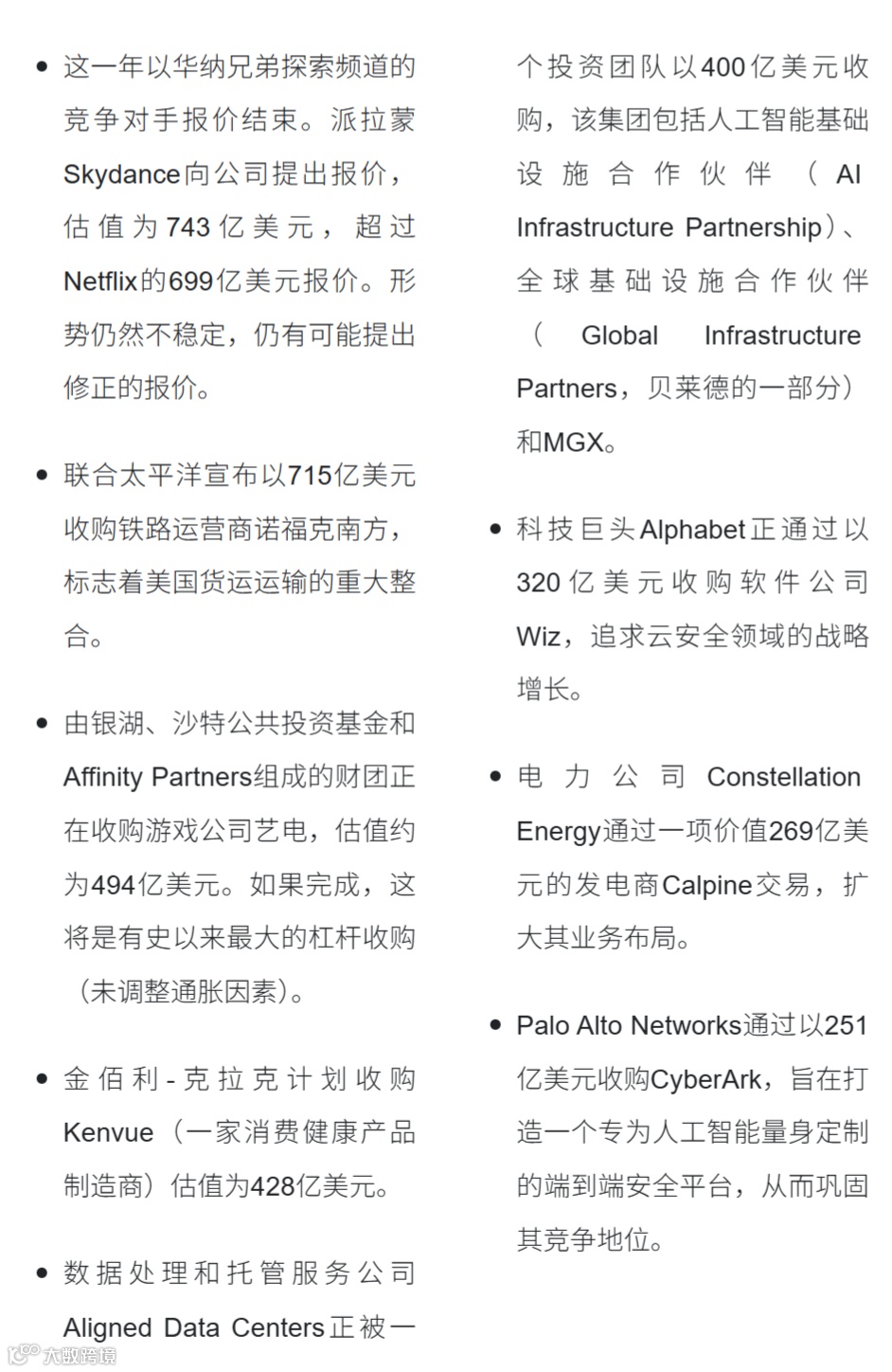 巨额交易极大推动了2025年并购的增长。在2025年宣布的所有交易中,以下是最大的几笔: