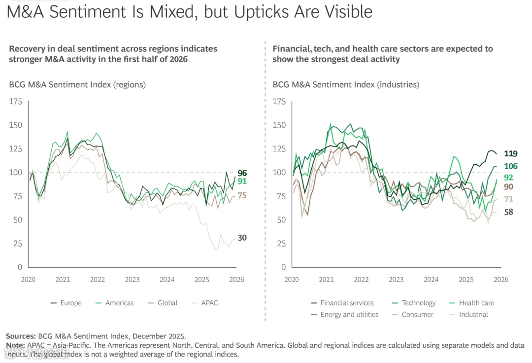 反映这一复杂局势,波士顿咨询集团的并购情绪指数显示,随着交易者进入2026年,信心稳健。尽管较低点有所改善,全球指数仍低于长期历史平均水平。然而,欧洲和北美的情绪已接近历史平均水平。与此同时,全球行业情绪呈上升趋势,科技和金融服务业现已高于其长期平均水平。结果是今年的常见起点:乐观情绪再次上升,但信心对宏观经济和地缘政治信号的变化依然存在。