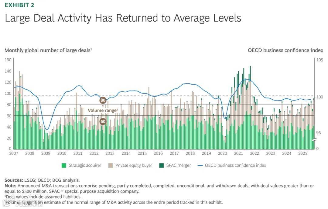 在巨额交易中应用纪律。 巨额交易的复兴既带来机遇,也带来风险。较大的交易本质上风险更高,其复杂性要求严格执行。波士顿咨询集团最近的一项分析显示,拥有强大巨额交易能力的公司——包括清晰的战略理由和完善的整合手册——持续优于同行,并有效降低下行风险。鉴于未来可能出现更多巨额交易,保持纪律对创造价值至关重要。