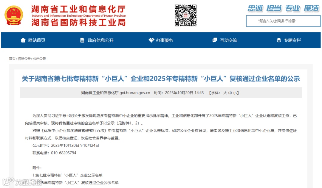 国家级榜单揭晓,湖南再添 77 家 “优等生”。2025年10月,工业和信息化部正式公示第七批专精特新 “小巨人” 企业及 2025 年复核通过企业名单,湖南省成果丰硕。