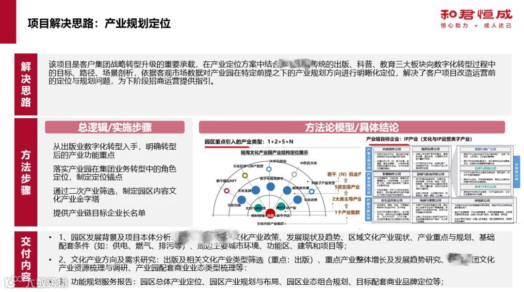 从传统文化产业数字化转型到存量产业园盘活运营,从产业定位顶层设计到产商融合落地实施,专业咨询团队始终以深度的产业洞察与高落地性的咨询方案,助力企业破解发展难题、实现战略升级。
