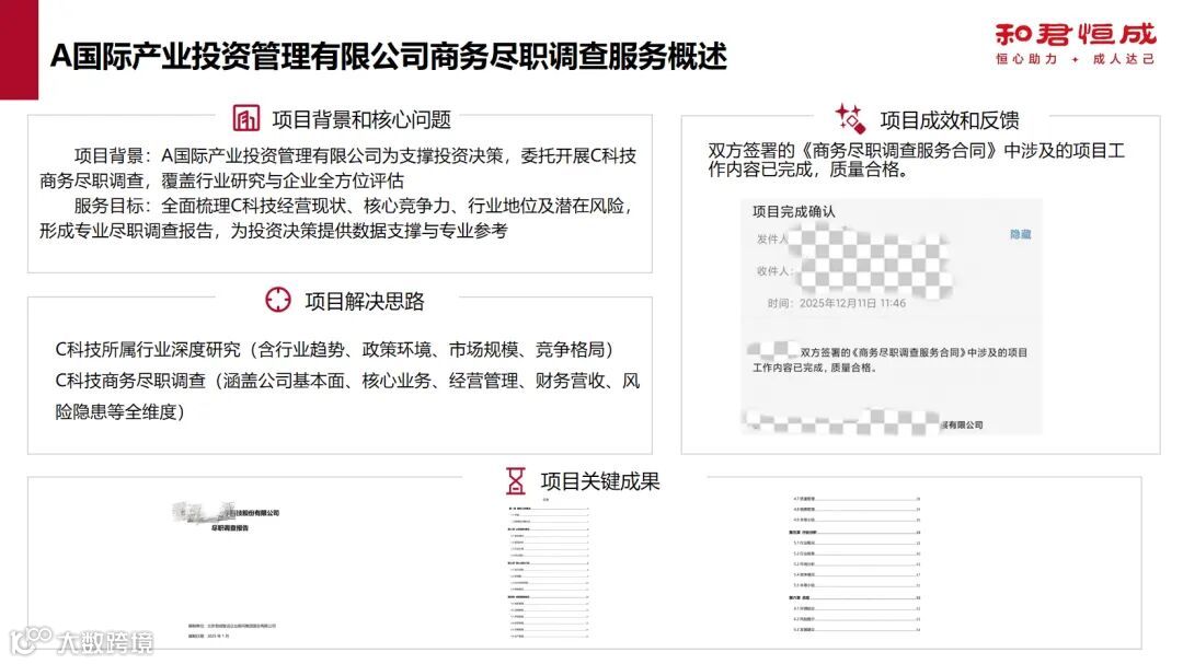 2025 年 12 月,委托方相关业务部门正式发函确认,双方合同约定的全部项目工作内容已圆满完成,成果质量合格。该尽职调查报告为委托方精准判断目标企业投资价值提供了关键依据,有效支撑了投资决策的科学性与合理性。此次合作的成功,得益于咨询机构在产业投资尽调领域的专业积淀 —— 坚持多维度交叉验证、数据与实地调研相结合的核心原则,既深挖显性风险,也洞察隐性价值;同时离不开委托方提供的精准背景信息、明确投资关注重点,以及目标企业的积极配合。