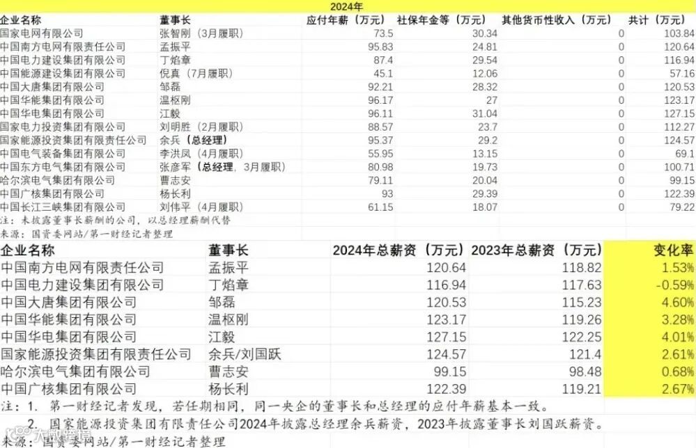 若计入社保、企业年金等单位缴存福利,收入排行略有调整:中国华电董事长江毅以127.15万元总收入登顶,国家能源投资集团总经理余兵(124.57万元)、中国华能董事长温枢刚(123.17万元)分列二三位。值得注意的是,14家企业中有6家“一把手”为2024年中途履新,应付年薪未超90万元,未能反映全年完整收入水平。