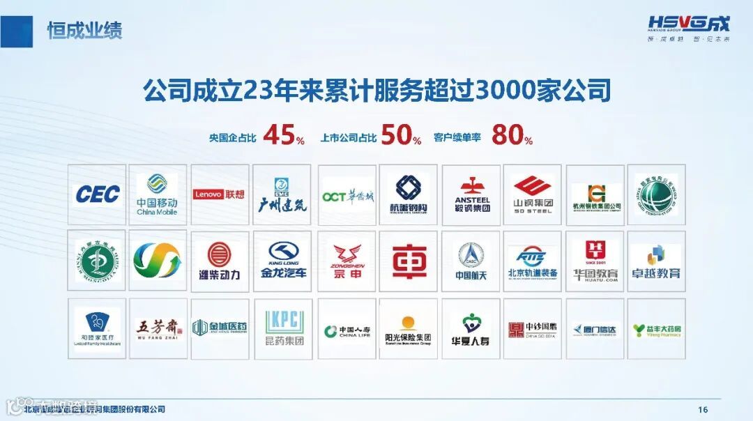 顶尖团队与 23 年实战积淀,计划由行业顶尖专家领衔护航,集结 300 + 专业人才团队,包括政府特殊津贴专家杨良生先生、清华大学杨百寅、朱武祥等顶尖学者,以及 60 + 资深顾问、30 + 实战专家,平均从业年限超 10 年,精准把握各行业发展痛点。作为工信部联合推荐的首批管理咨询机构,恒成 23 年来深耕实体经济,服务覆盖中核、中车、联想等 3000 + 大中型企业,央国企占比 45%、上市公司占比 50%,客户续单率高达 80%。我们构建 “咨询 + 产业 + 人才” 三位一体业务布局,在全国设立 17 家分支机构,海外聚焦东南亚、中亚市场,形成网格化服务网络,聚焦 10 大支柱产业与战新产业,精准匹配国家战略需求。