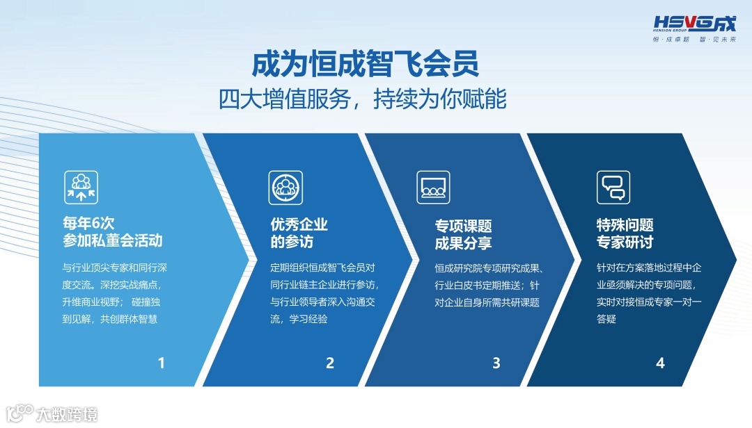 覆盖经营全场景的服务矩阵:围绕企业成长全周期需求,我们打造 “1+5” 综合咨询服务体系,构建覆盖八大核心板块的全场景服务矩阵。战略咨询明确 “往哪走、如何赢” 的发展路径,组织咨询激活组织活力,人才咨询打造核心动能,财务咨询优化资源配置,营销咨询破解市场难题,生产咨询筑牢效率根基,出海咨询拓展国际版图,文化咨询凝聚团队共识。成为会员更可享受四大稀缺增值服务:每年 6 次私董会与行业顶尖专家深度交流,定期参访产业链主企业学习先进经验,获取恒成研究院专项研究成果与定制化共研服务,针对落地难题对接专家一对一答疑,全方位链接优质资源、拓宽发展视野。