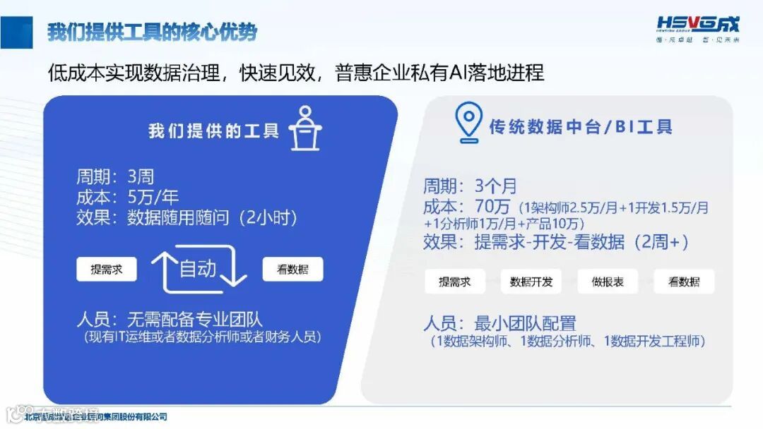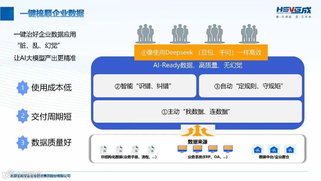 恒成智远以 “实践 - 复盘 - 迭代 - 优化” 为核心理念,构建了覆盖战略到落地的全流程服务体系。在咨询规划层面,提供企业战略、组织绩效、市场营销、数据治理等多维度方法论支持,结合 “业务 - 数据 - 应用 - 技术” 四层架构设计,输出定制化 IT 建设路径与落地蓝图。技术工具方面,自主研发 “DataForAI” 数字底座工具,实现一天部署开箱即用、一周接入数据的高效落地,数据质量提升 90% 以上,降低 70% 人工数据治理成本。落地执行阶段,通过驻场陪跑、跨部门协同机制搭建等方式,确保方案从纸面落到实处,形成 “诊断 - 规划 - 实施 - 优化” 的闭环服务。