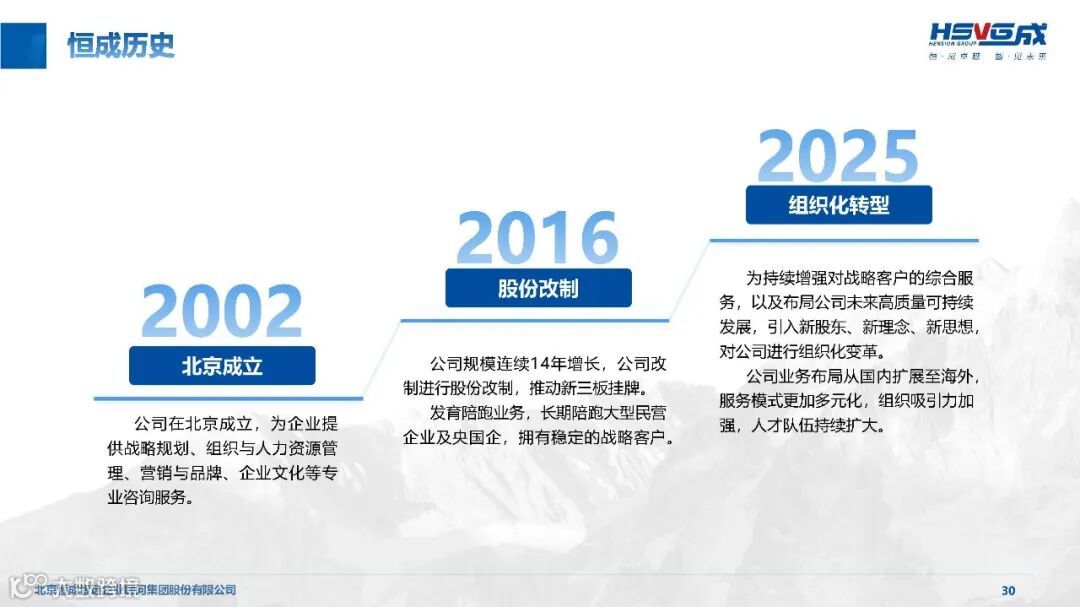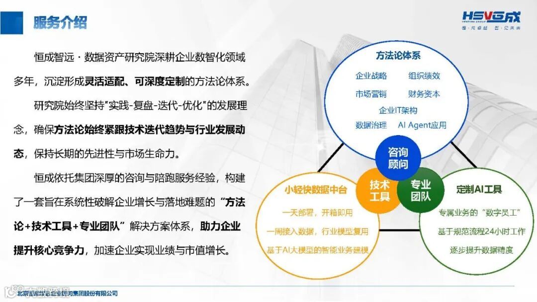 恒成智远深耕企业数智化领域多年,依托集团 23 年管理咨询积淀与陪跑服务经验,打造了 “方法论 + 技术工具 + 专业团队” 的一体化解决方案体系,助力企业打破转型壁垒,实现从 “经验驱动” 向 “数据 + 知识双轮驱动” 的智能运营新范式跨越。