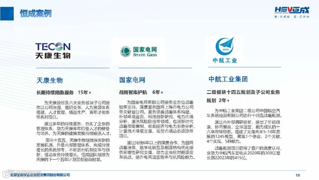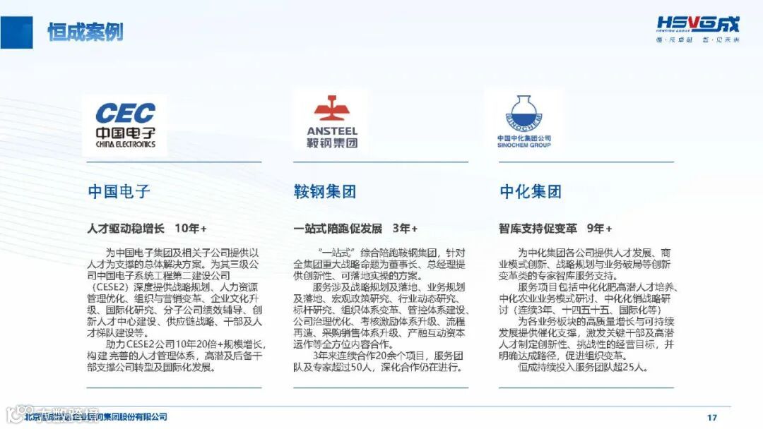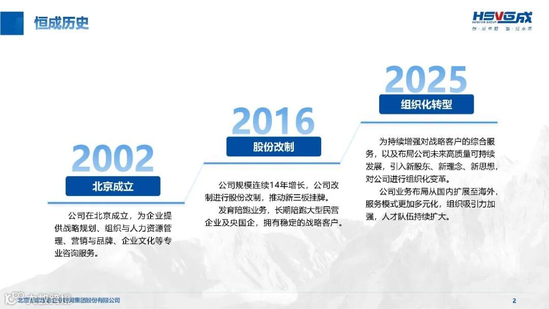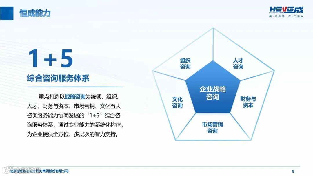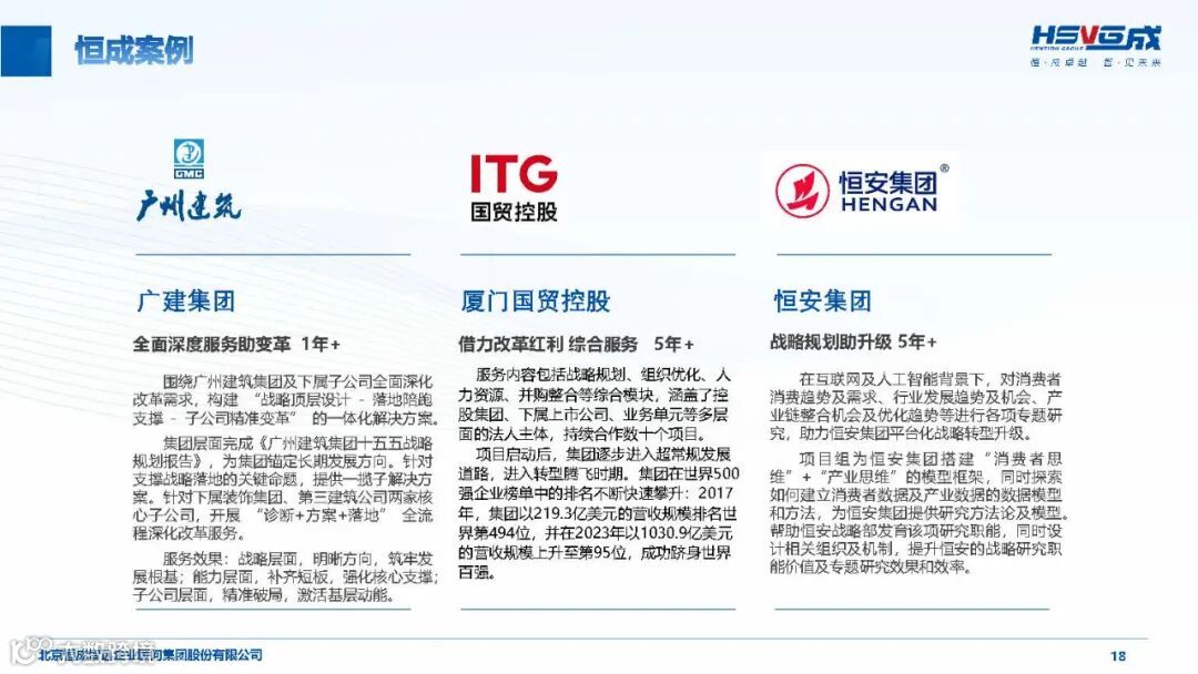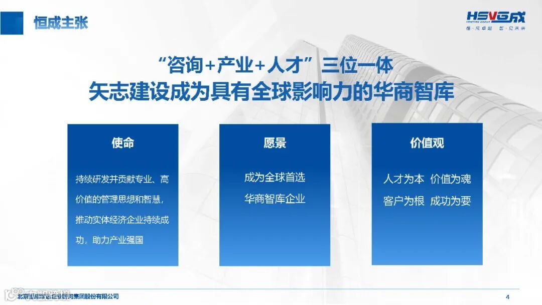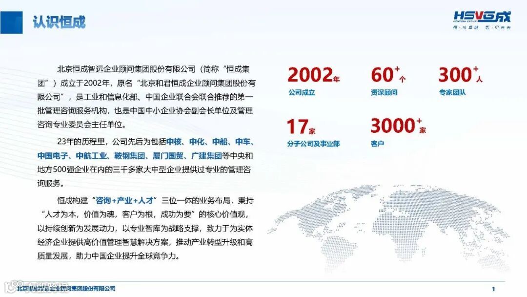 恒成智远(HSVG)成立于 2002 年,是工信部与中国企业联合会联合推荐的首批管理咨询服务机构,深耕行业 23 年,已发展为覆盖 “咨询 + 产业 + 人才” 三位一体的综合性华商智库,致力于为实体经济企业提供高价值管理智慧解决方案,推动产业转型升级与高质量发展。