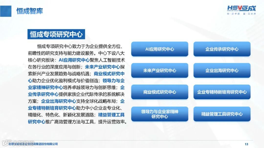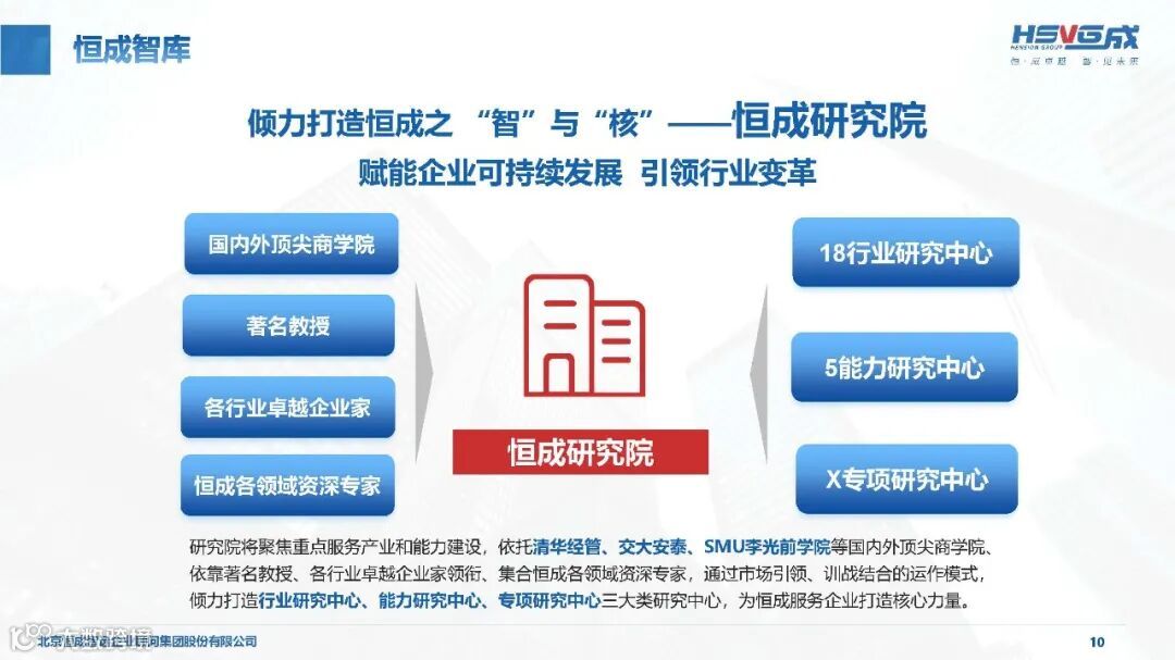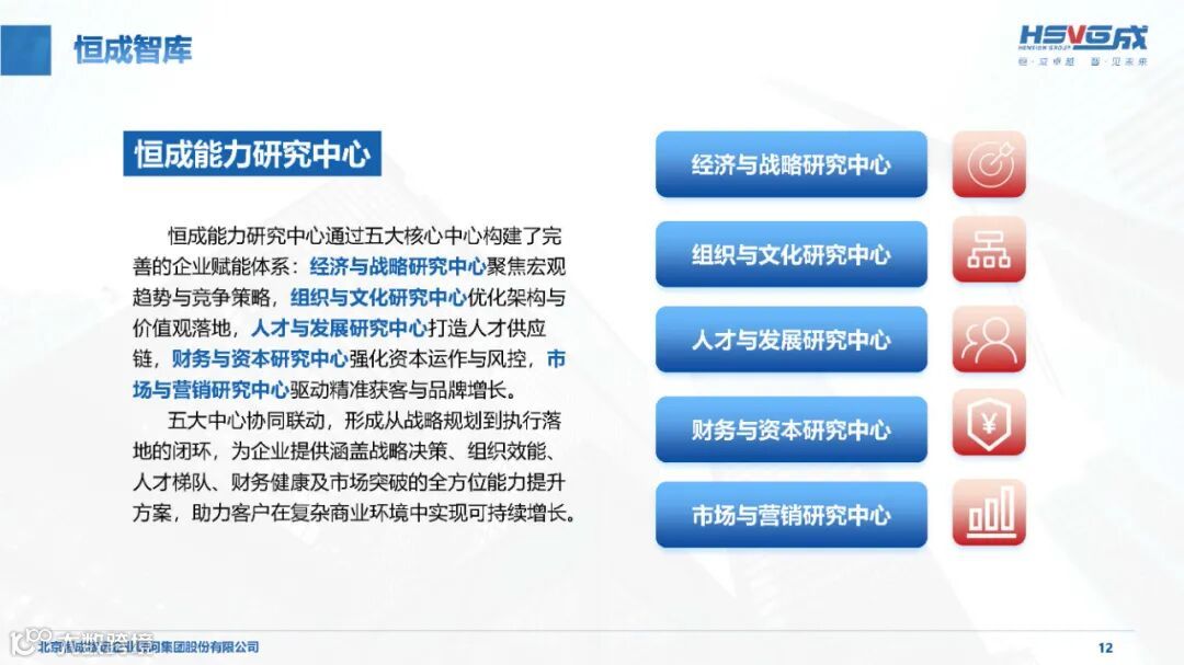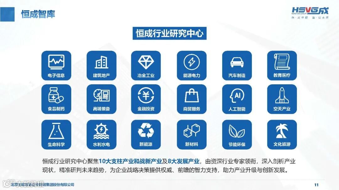依托恒成研究院,设立 18 个行业研究中心、5 个能力研究中心及多个专项研究中心,聚焦 10 大支柱产业、8 大战新产业,精准研判行业趋势,为企业战略决策提供权威前瞻支持。