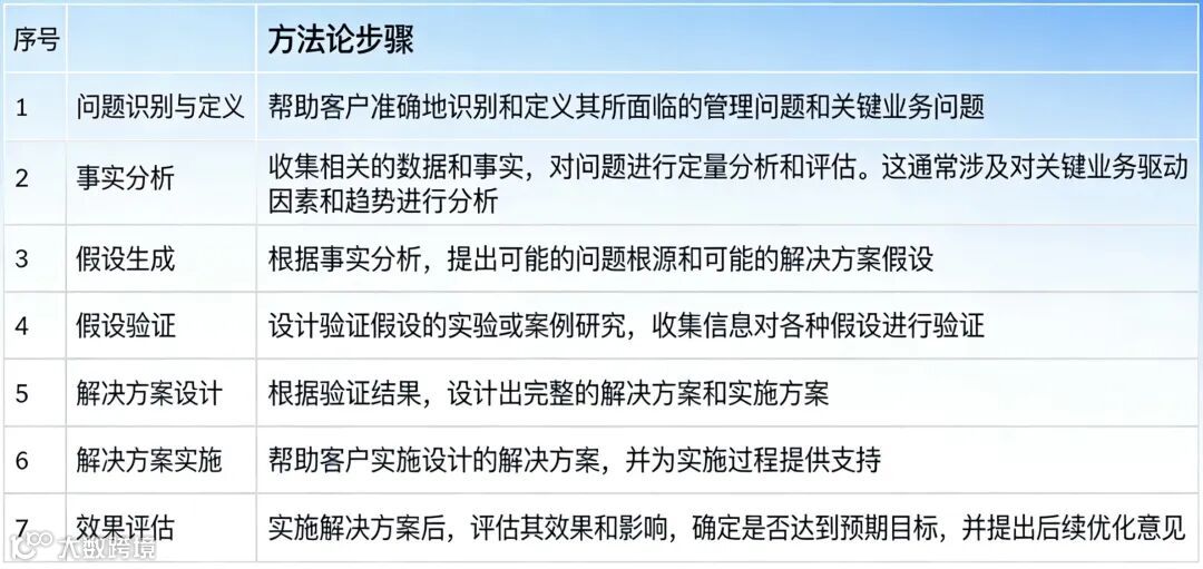 1. 梳理核心业务场景的问题解决步骤,参照麦肯锡7步方法论(问题识别与定义→事实分析→假设生成→假设验证→解决方案设计→解决方案实施→效果评估),制定适配自身业务的标准化思考流程。