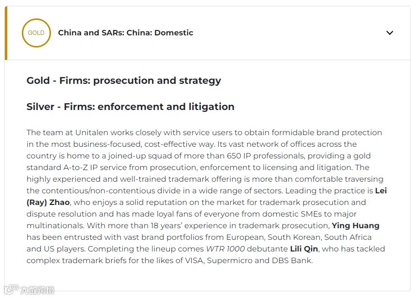 WTR 评价:“黄莺律师拥有超过20年知识产权从业经验,曾为众多国内企业和来自欧洲、韩国、南非和美国的国际企业策划商标申请和行政诉讼方案。”