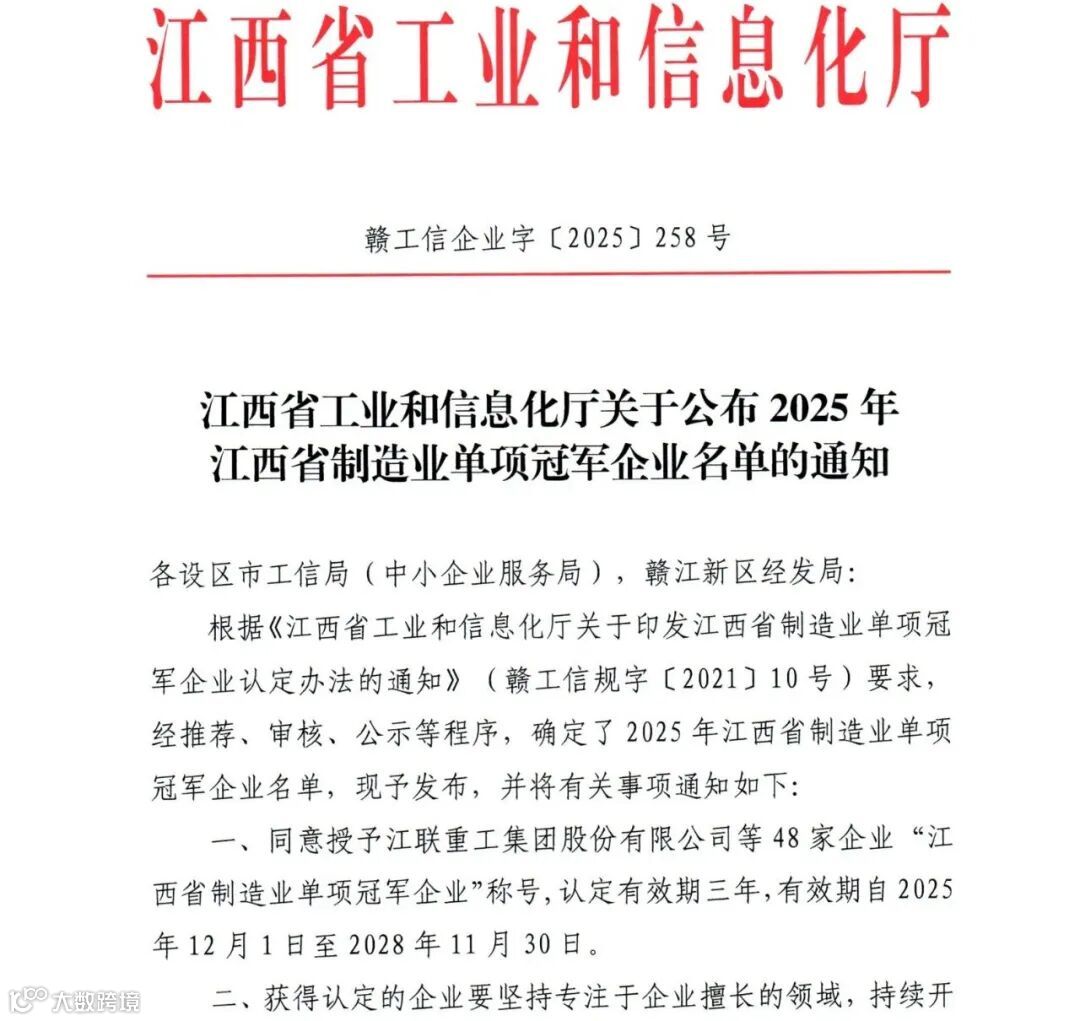 2025 年11月,江西省工业和信息化厅正式印发《关于公布 2025 年江西省制造业单项冠军企业名单的通知》(赣工信企业字〔2025〕258 号),依据《江西省制造业单项冠军企业认定办法》,经推荐、审核、公示等严格程序,确定江联重工集团股份有限公司等 48 家企业为 2025年省级制造业单项冠军企业,认定有效期自 2025 年12月1日至 2028年 11月30日。