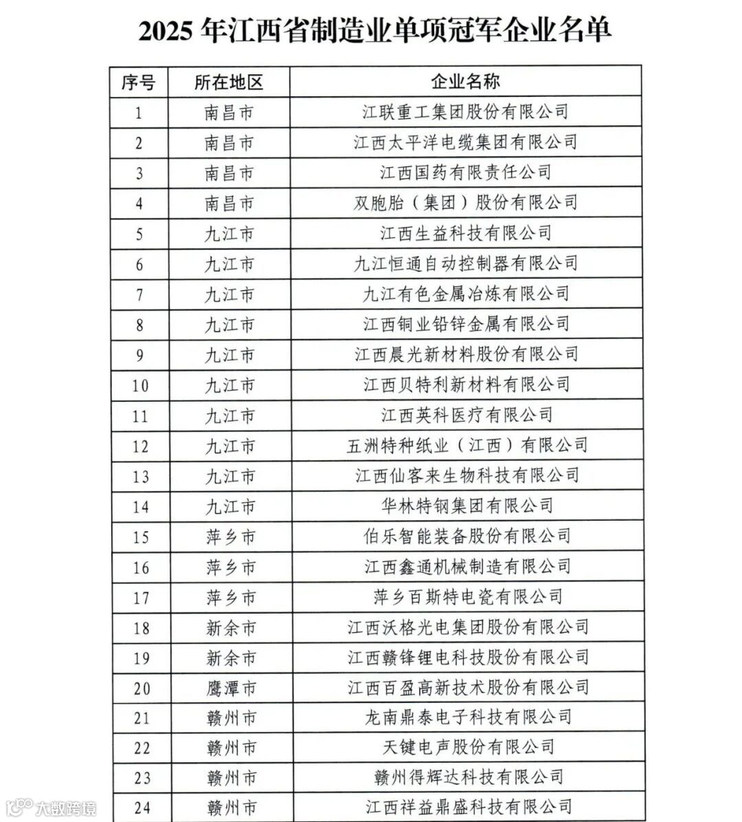 此次名单的发布,不仅是对江西制造业细分领域标杆企业的权威认可,更标志着全省 “专精特新” 企业培育体系迈向 “单项冠军引领、产业集群升级” 的新阶段,为工业经济高质量发展注入强劲动能。