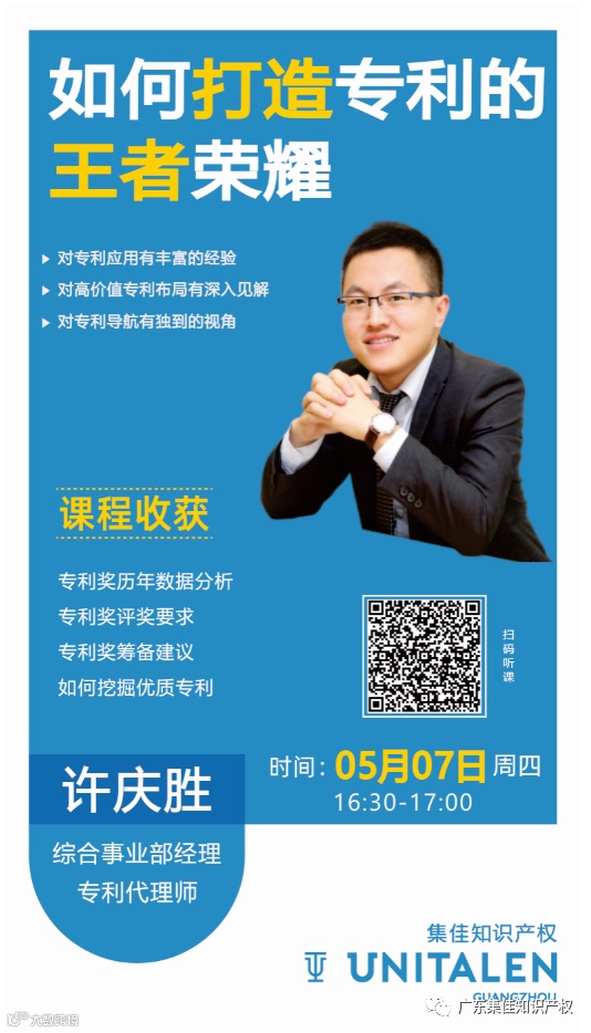 导读:5月7日(周四)下午4:30,集佳知识产权直播课堂将进行《如何打造专利的王者荣耀》的在线直播,由资深专利代理师、集佳广州分公司综合事业部经理许庆胜主讲。欢迎大家扫码观看!
