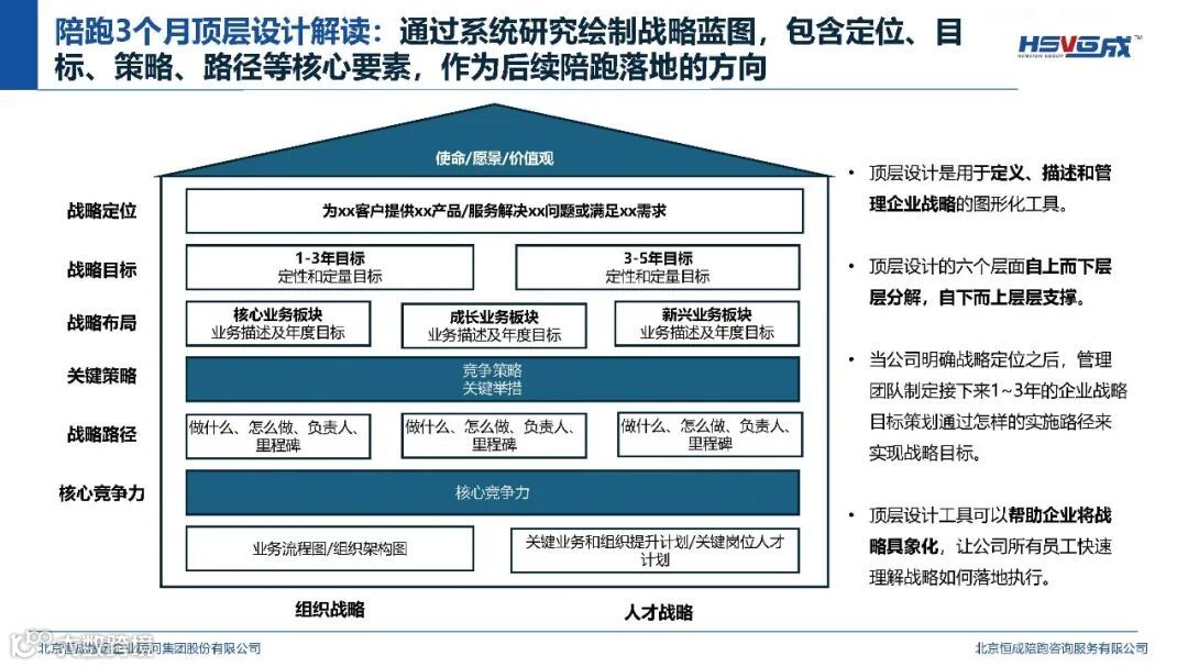 3 个月・绘蓝图:组建 3-5 人专属项目组,做行业 / 标杆研究,输出含 “定位、目标、路径、策略” 的顶层设计方案;