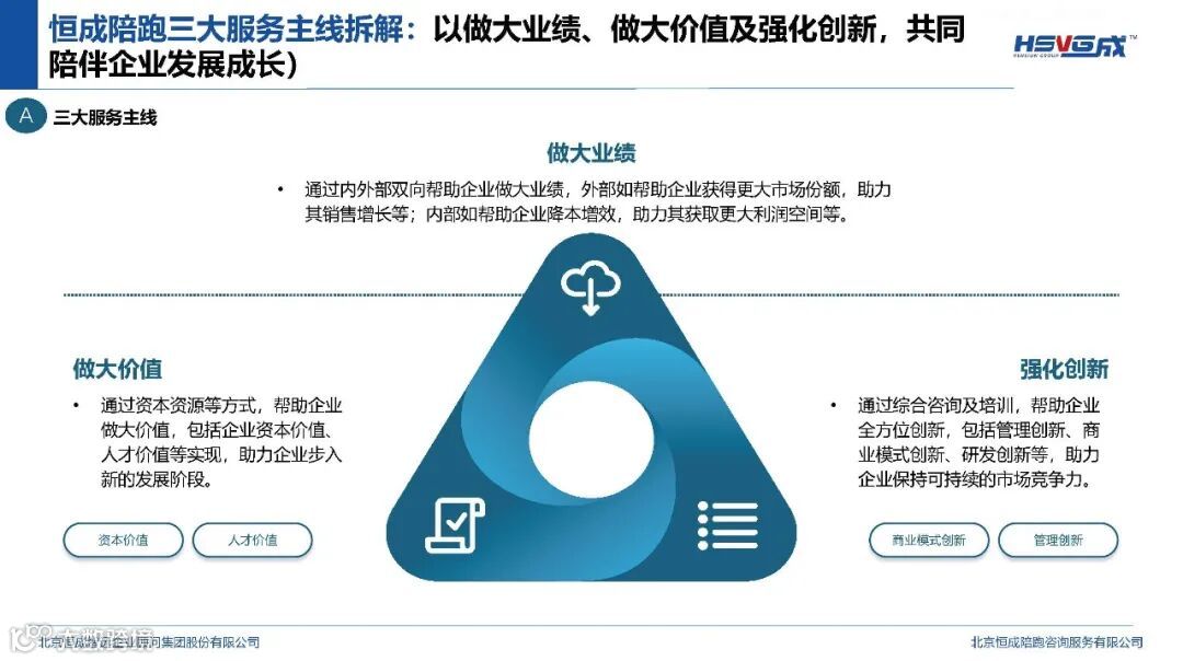 三大核心主线做大业绩:外拓市场增销售,内降成本提利润;做大价值:资本运作(投融资 / 上市辅导 / 市值管理)+ 人才赋能(全周期培养 / 猎聘);强化创新:管理创新(12 大领域定制方案)+ 商业模式 / 研发突破。