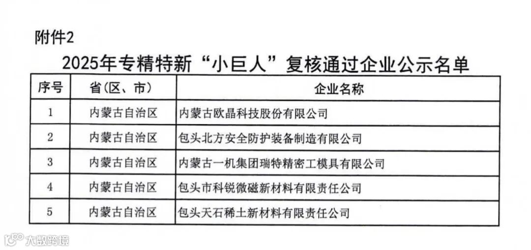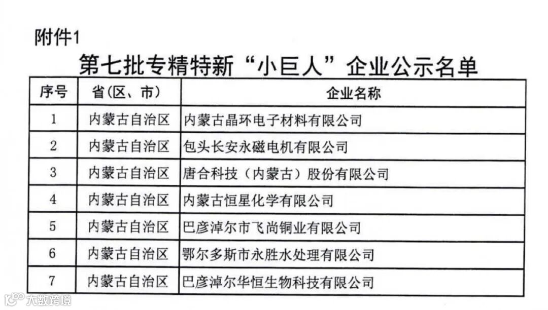 内蒙古第七批专精特新“小巨人”复核通过企业