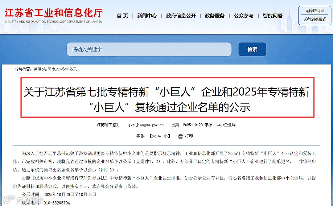 2025年10月20号,工业和信息化部公示第七批专精特新 “小巨人” 企业,作为我国经济转型升级的重要力量,专精特新 “小巨人” 企业此次在江苏省的入选情况备受关注。从公示名单来看,江苏省此次入选企业不仅数量可观,更在产业分布、技术创新、区域布局等维度呈现出鲜明特征,充分展现了江苏省在培育细分领域龙头企业、夯实制造业根基方面的显著成效,为全省乃至全国的产业高质量发展注入新活力。