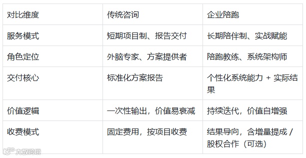 传统咨询常陷入 “方案交付即终结” 的困境,而企业陪跑以 “深度共生、实战赋能、持续进化” 为核心理念,摒弃单一报告式输出,转型为 “教练 + 架构师 + 伙伴” 的三重角色。我们深刻认知到:企业的可持续发展,本质是 “业务执行系统” 与 “团队心智系统” 的协同进化,增长瓶颈往往源于战略与执行脱节、能力与目标不匹配、传承与发展断层。