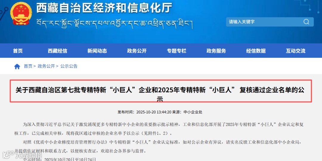 2025年10月20日,西藏自治区工业和信息化厅、中小企业发展局根据工业和信息化部 2025 年专精特新 “小巨人” 企业认定工作部署,完成相关审核流程,正式公示西藏第七批专精特新 “小巨人” 企业名单。