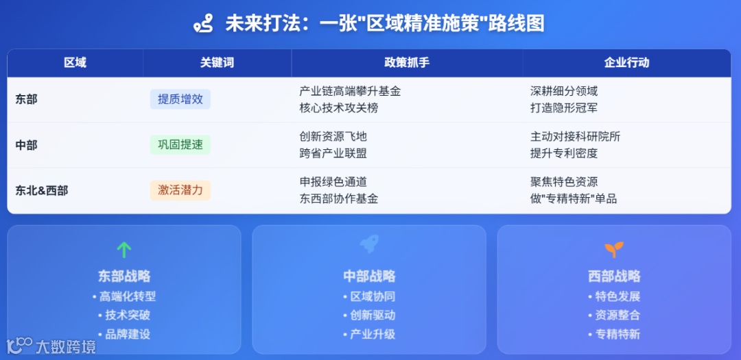 未来政策将针对不同区域精准施策:东部发达省份需聚焦 “提质增效”,引导企业向产业链高端攀升,强化核心技术自主可控;中部省份需巩固增长势头,加大创新资源导入与产业集群培育,打造细分领域 “单项冠军”;东北及西部省份则需加强政策倾斜与资源对接,优化创新生态,助力中小企业突破转型瓶颈。