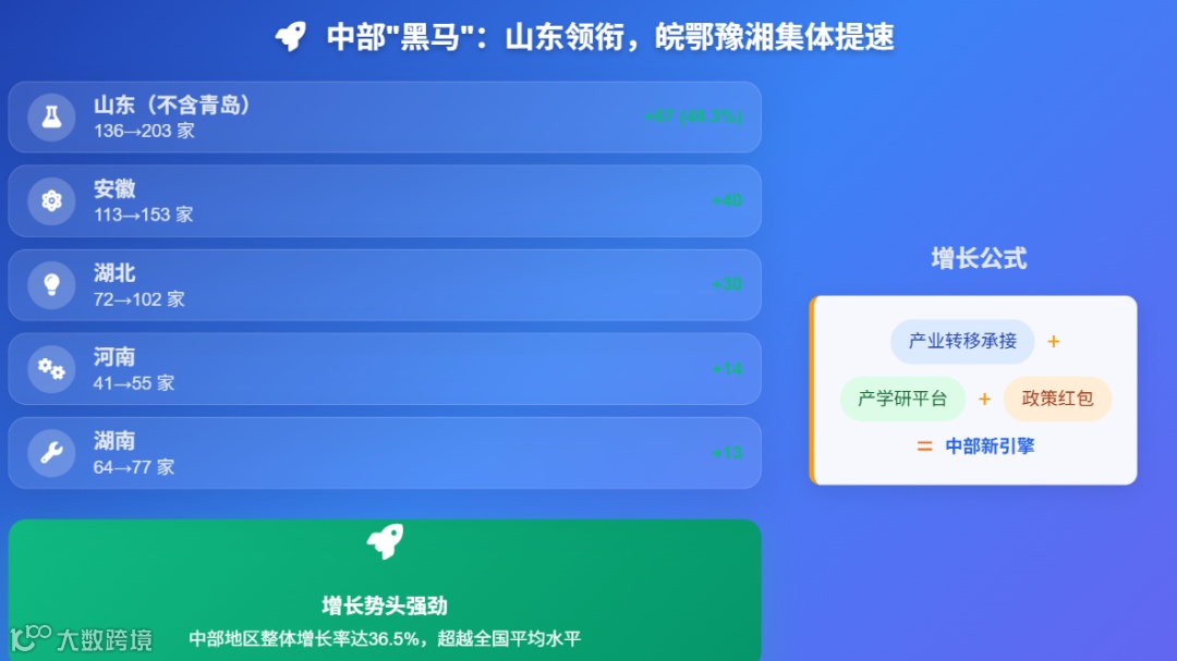 山东省(不含青岛)表现最为突出,第六批 136 家,第七批激增至 203 家,增幅 67 家,增长幅度达 49.3%,这得益于其新旧动能转换战略下对高端化工、新能源等产业的扶持,以及产学研合作平台对企业创新能力的提升。安徽省作为 “后起之秀”,依托合肥综合性国家科学中心资源,在人工智能、新能源汽车领域快速布局,两批次从 113 家增至 153 家,增幅 35.4%,彰显 “科技 + 产业” 双轮驱动成效。此外,湖北省(从 72 家至 102 家)、河南省(从 41 家至 55 家)、湖南省(从 64 家至 77 家)均保持稳定增长,通过承接东部产业与培育本土企业,持续壮大 “小巨人” 队伍。