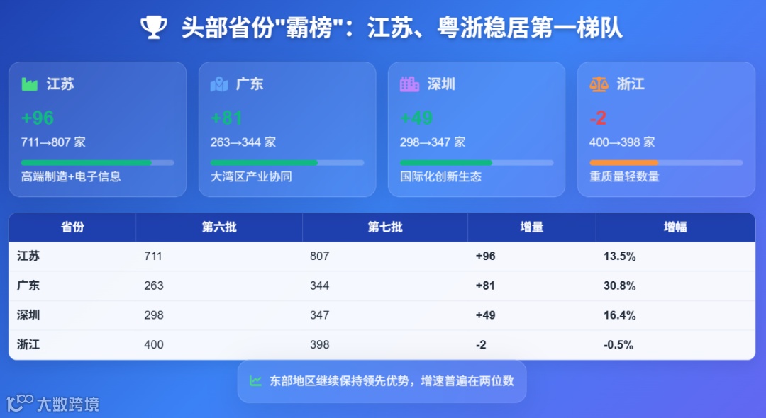 江苏省作为多批次 “冠军省份”,第六批公示 711 家,第七批增至 807 家,增幅 96 家,其高端制造、电子信息、新材料等优势产业的集群效应,以及地方政府系统化支持,形成 “培育 — 申报 — 成功” 的良性循环。广东省(不含深圳)与深圳市表现同样亮眼,前者两批次从 263 家增至 344 家,增幅 30.8%,后者从 298 家增至 347 家,粤港澳大湾区的产业协同与国际化环境为企业提供广阔空间。浙江省(含宁波)虽小幅回落 2 家(从 400 家至 398 家),但整体规模仍稳居前列,此次波动被认为是地方从严把控申报质量、坚持 “重数量更重质量” 导向的体现。
