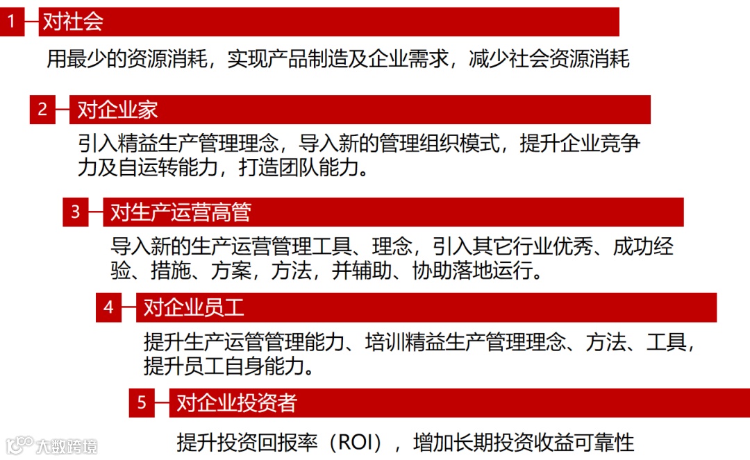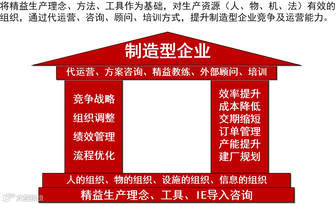 精益生产研究中心聚焦制造型企业,以精益生产理念、方法和工具为核心,先剖析企业在现场、效率、质量、设备、成本、交期、员工士气七方面存在的诸如现场混乱、效率低下、质量不稳定等具体问题。接着,构建起完善的服务体系,底层以 “人的组织、物的组织、设施的组织、信息的组织” 以及精益生产理念、工具、IE 导入咨询为基础支撑;中层通过代运营、方案咨询、精益教练、外部顾问、培训等服务方式,作用于企业竞争战略、组织调整、绩效管理、流程优化以及效率提升、成本降低等多维度;最终服务于制造型企业,助力其提升竞争与运营能力。从社会层面看,能减少资源消耗;对企业家,可引入新管理模式,增强企业竞争力与团队能力;对生产运营高管,能导入新工具理念并辅助落地;对企业员工,可提升其管理能力与自身素养;对投资者,能提高投资回报率,保障长期收益。