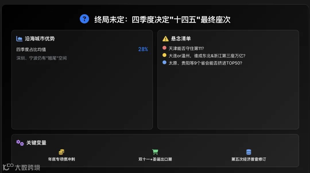 值得强调的是,前三季度GDP数据并非全年最终定论。沿海城市四季度经济占比普遍更高,后续增长潜力仍待释放,年度城市格局尚未完全锁定。同时,TOP50城市中仍有太原、贵阳、乌鲁木齐等9个省会城市未能跻身,而温州、徐州、大连冲刺万亿的进程,以及中西部非省会城市的最终排位,都将在“十四五”收官的最后阶段揭晓。这些变量不仅关乎单个城市的发展定位,更将勾勒出我国区域经济协调发展的全新图景。