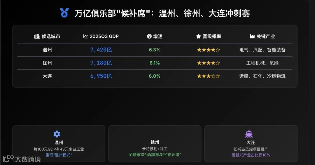 今年我国内地万亿GDP城市有望再添新成员,温州、徐州、大连成为核心竞逐者,三地前三季度增速均达6%及以上,具备冲击万亿的实力。若成功晋级,温州将成为浙江第三座万亿城市,徐州跻身江苏第六座万亿城市,大连则将打破东北无万亿城市的局面。三者产业结构各具特色:温州以工业为核心,电子、电气、汽车制造等产业保持两位数增长,重现“温州模式”高光;徐州依托工程机械这一“一号产业”,叠加新能源、数字经济等千亿级产业,扛起苏北崛起与淮海经济区发展重任;大连凭借港口与造船业优势发力,但需破解石化产业占比过高、新兴产业培育不足的短板。