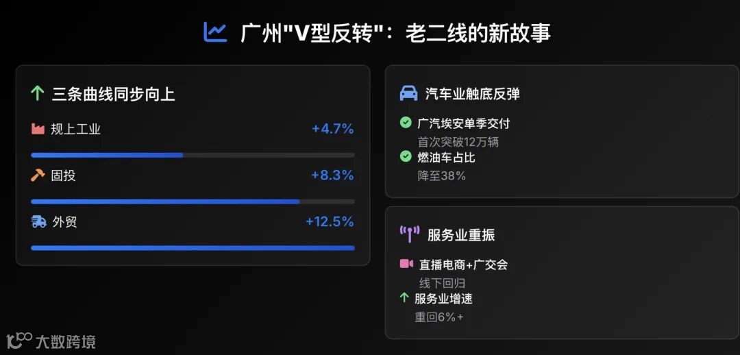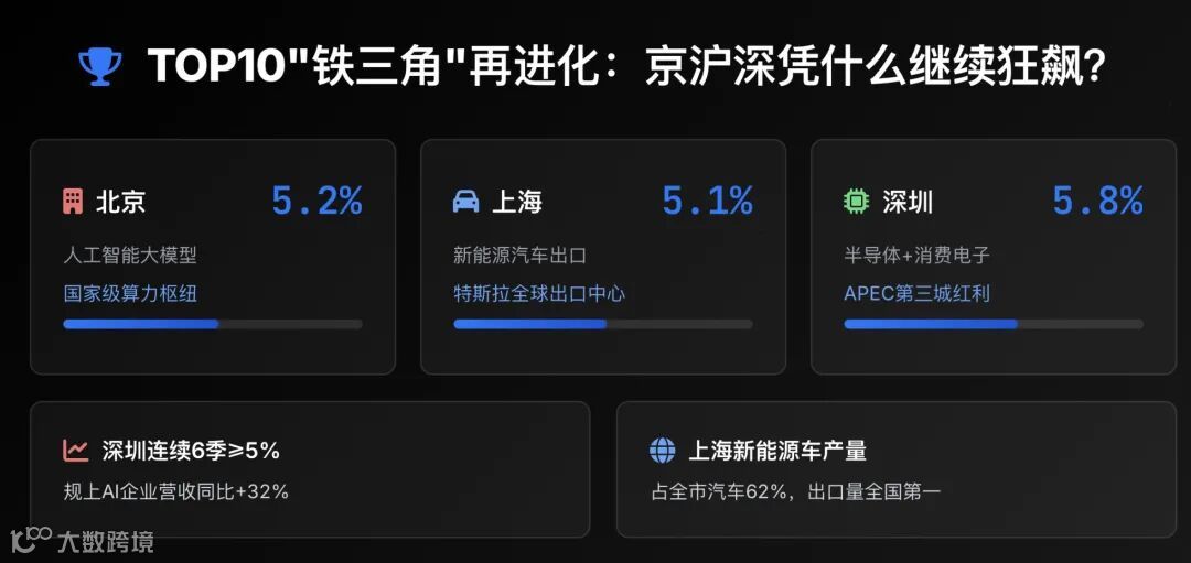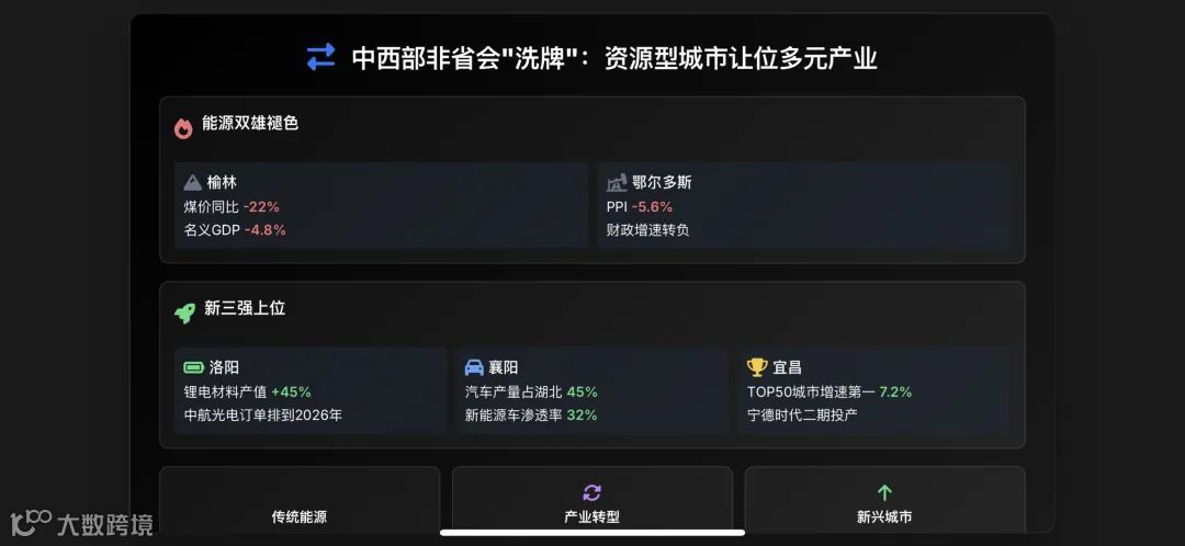 中西部非省会第一城的争夺迎来新变局。此前凭借煤炭产业异军突起的榆林、鄂尔多斯,受能源价格走低与PPI负增长影响,名义GDP承压,而洛阳、襄阳、宜昌凭借多元产业结构重新占据竞争优势。洛阳以工业为根基,引入锂电、电子等新兴产业实现复苏;襄阳依托“武襄十随”汽车产业集群的深厚底蕴,持续巩固汽车工业优势;宜昌前三季度GDP增速位居TOP50城市之首,工业、外贸、投资全面发力,锂电、生物医药等新兴产业成为增长核心。这场竞争印证了非省会城市的发展关键——脱离资源依赖,以多元新兴产业筑牢发展根基。