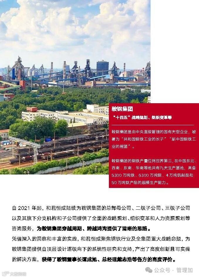 鞍钢集团:从战略规划到组织变革,和君恒成提供全链条支持,帮其穿越周期,解决方案获董事长高度认可;