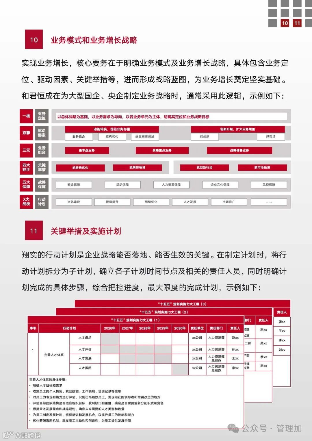 关键举措:比如 “完善人才体系”,拆解为人才盘点、评估、发展、激励等子任务,明确时间节点、责任部门;