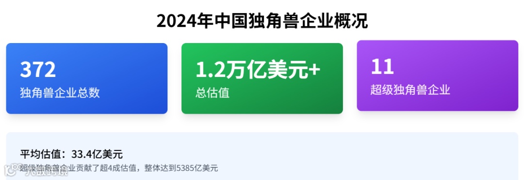 2024 年中国 372 家独角兽企业总估值超 1.2 万亿美元,平均估值 33.4 亿美元;其中 11 家超级独角兽贡献了超 4 成估值,合计达 5385 亿美元,头部企业估值优势显著。
