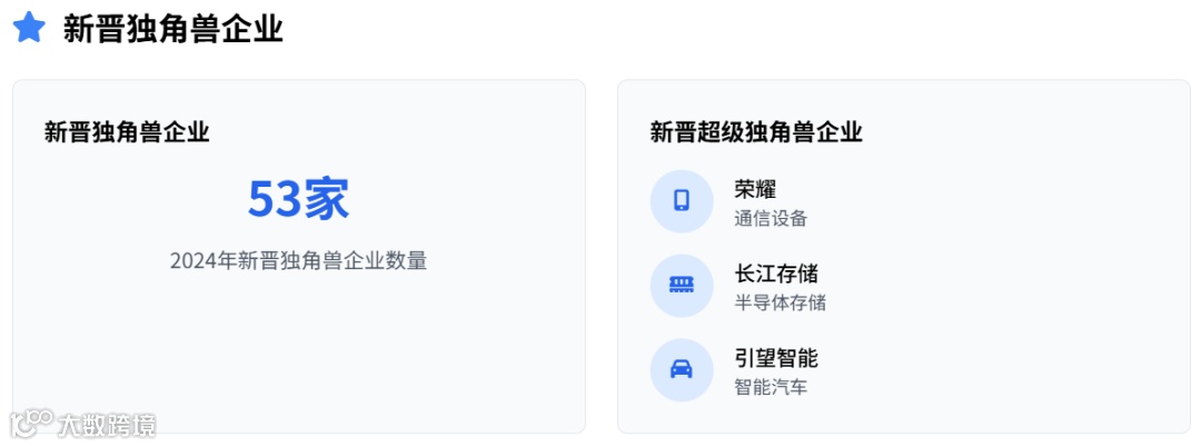 2024 年中国独角兽企业共有 372 家,总估值超过 1.2 万亿美元,平均估值为 33.4 亿美元。其中,11 家超级独角兽企业贡献了超过四成的估值,合计达 5385 亿美元。2024 年新增了 53 家独角兽企业,包括荣耀、长江存储、引望智能这 3 家新晋超级独角兽。从历年数量趋势来看,2016-2024 年整体呈波动变化,2019 年达到 375 家的峰值,2024 年略有回落至 372 家。