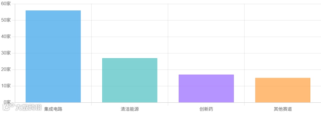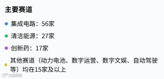 覆盖 41 个赛道,呈现 “硬科技” 主导特征,集成电路以 56 家位居第一,清洁能源(27 家)、创新药(17 家)紧随其后,动力电池、企业数字运营等赛道企业数也均在 15 家及以上,反映出技术创新领域的强劲活力。