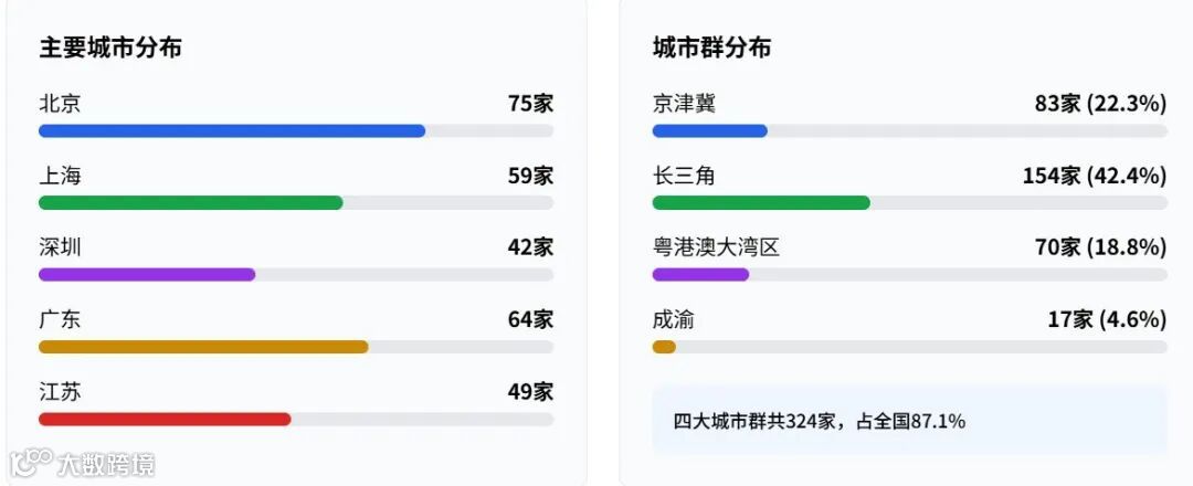 高度集中于 “北上深” 及四大城市群,北京(75 家)、广东(64 家)、上海(59 家)、江苏(49 家)为主要分布地;京津冀、长三角、粤港澳大湾区及成渝四大城市群集中了 87.1% 的企业,其中长三角(154 家)和京津冀(83 家)为核心集聚区,体现区域经济与创新资源的高度联动。