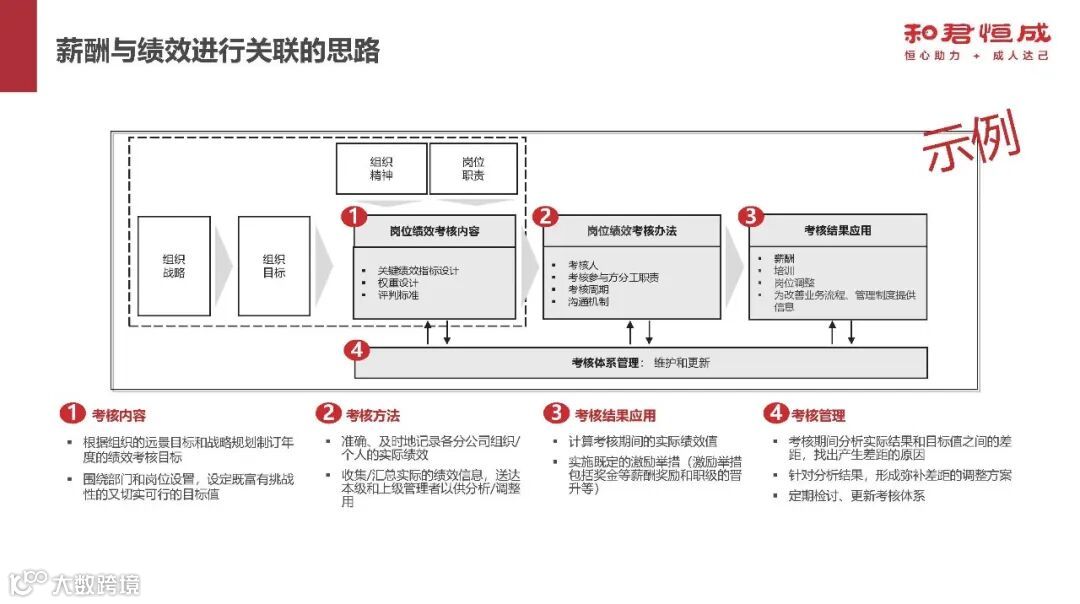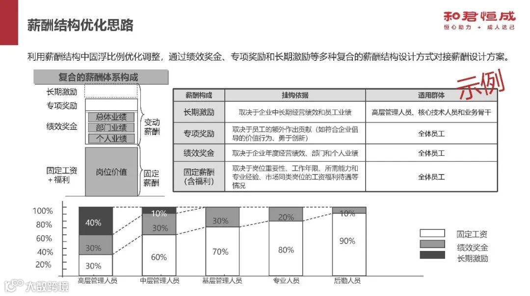 结构优化与关联:优化薪酬结构,通过调整固浮比例,采用绩效奖金、专项奖励和长期激励等复合方式设计薪酬。不同薪酬构成与员工业绩、企业经营绩效挂钩,适用于不同群体,同时将薪酬与绩效紧密关联,围绕组织战略目标设定考核指标、权重和评判标准,明确考核参与方职责和周期,考核结果应用于薪酬调整、培训、岗位调整等方面。