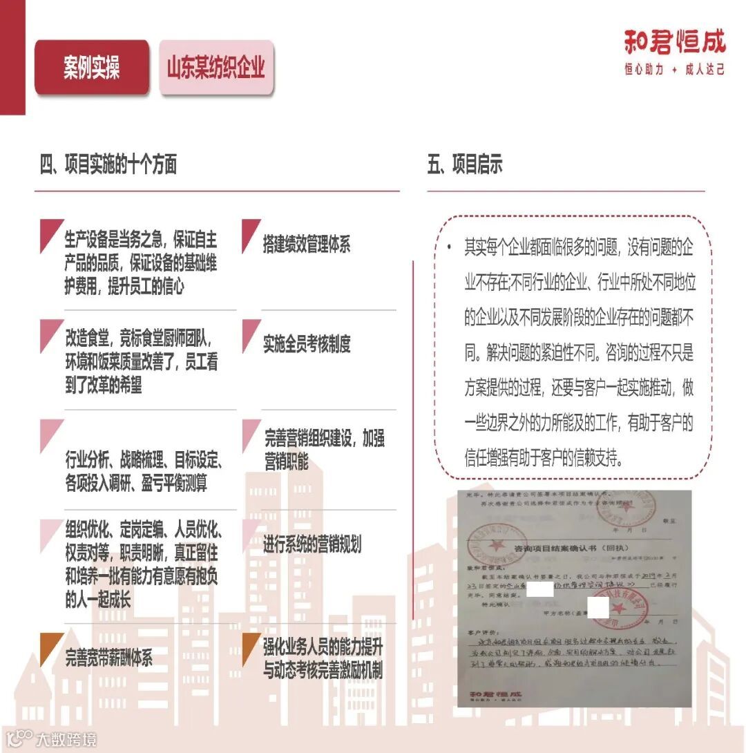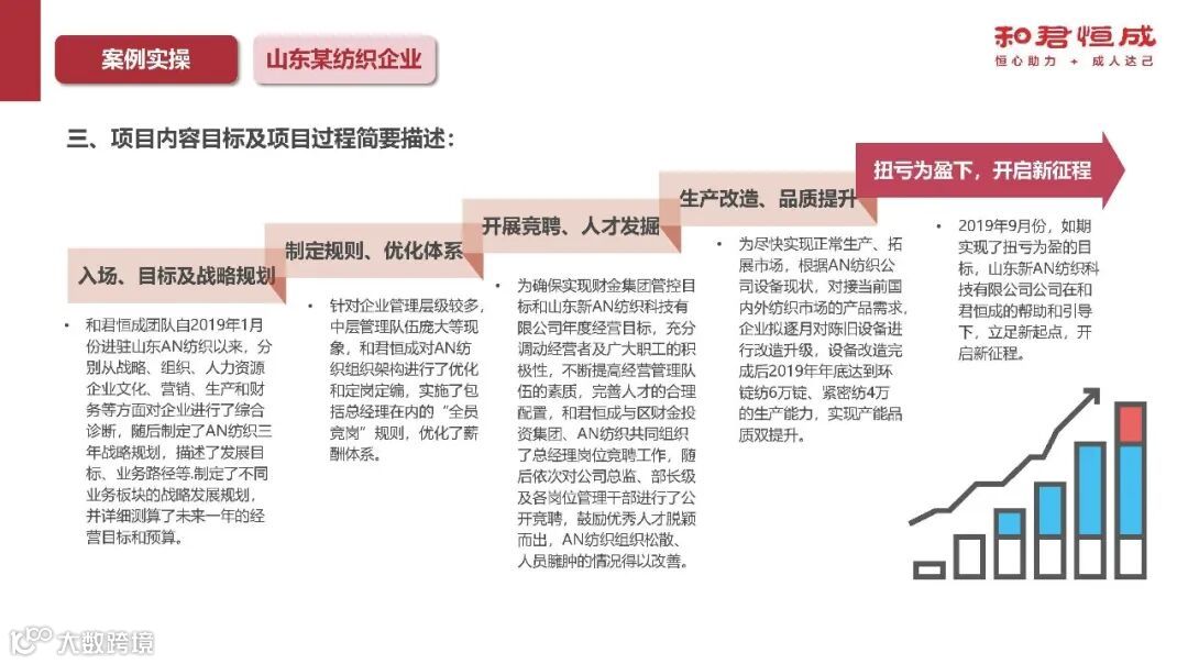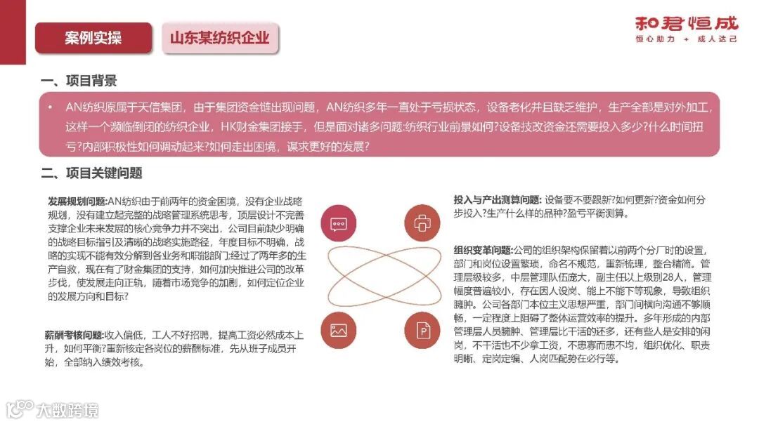 山东某纺织企业案例:AN 纺织被 HK 财金集团接手后,面临发展规划、薪酬考核、投入产出测算、组织变革等诸多问题。和君恒成团队进驻后,进行综合诊断,制定三年战略规划,优化组织架构和薪酬体系,实施全员竞岗,推动生产设备改造和品质提升。项目实施包含多方面工作,最终帮助企业在 2019 年 9 月实现扭亏为盈 。