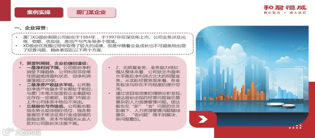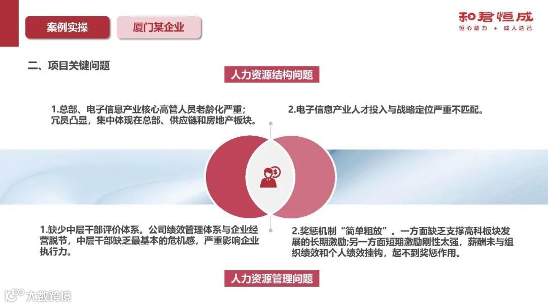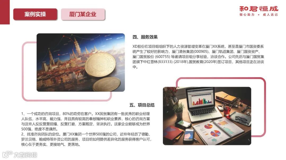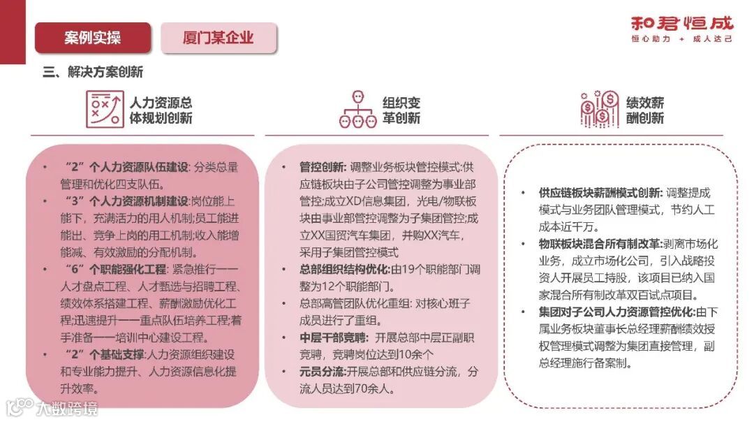 项目案例实践厦门某企业案例:厦门 XD 股份有限公司发展中面临资源利用弱、业务能力待加强等经营问题,背后存在复杂人力资源管理问题,如人员结构不合理、绩效管理体系与经营脱节等。和君恒成通过创新人力资源总体规划、组织变革、绩效薪酬等方面进行解决,实施分类管理队伍、建设用人用工分配机制、强化职能工程等举措,调整管控模式和组织结构,优化薪酬模式和混合所有制改革。项目取得良好效果,在当地产生影响力,吸引其他企业洽谈合作。