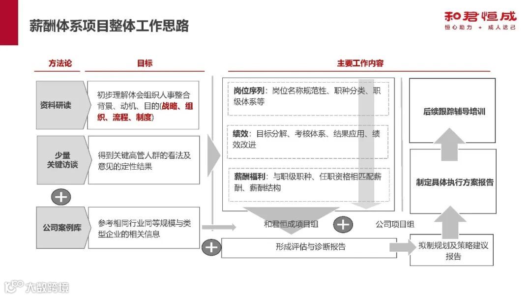 绩效薪酬业务工作思路与内容:开展薪酬体系项目时,先研读资料、进行关键访谈,初步理解组织人事整合背景等信息。主要工作涉及岗位序列规范、绩效目标分解与考核、薪酬福利设计,同时参考同行业企业信息,拟制规划和策略建议,形成评估诊断报告,后续还提供跟踪辅导培训。