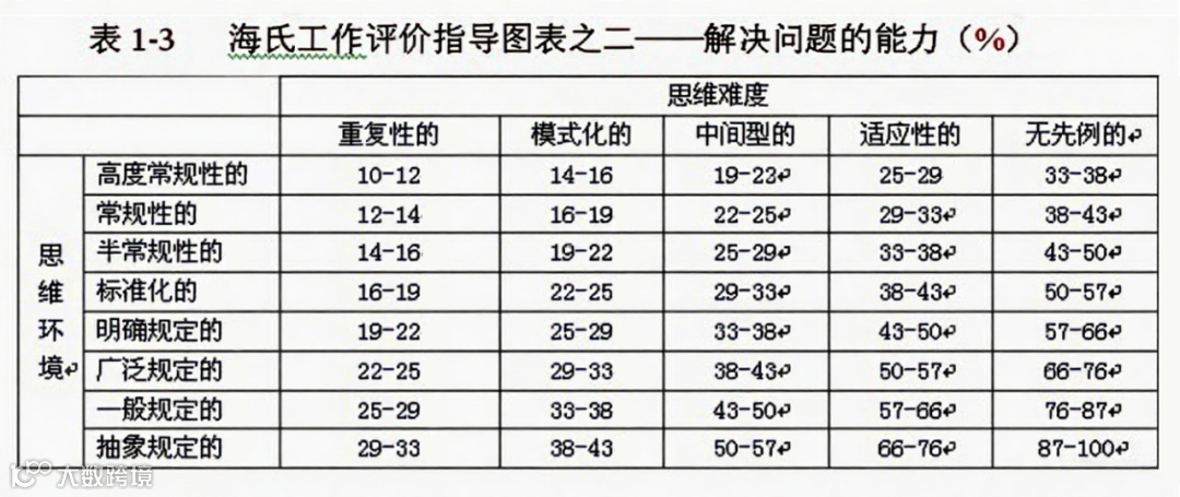 解决问题能力:衡量岗位承担者对环境的应变能力及处理问题的复杂程度,被视为 “技能水平” 的实际运用,以技能水平利用率(%)衡量,包含两个子因素。思维环境体现环境对岗位承担者思维的限制程度,从高度常规的到只做含糊规定的分为 8 个等级;思维难度反映解决问题对创造性思维的要求,从重复性的到无先例的分为 5 个等级。通过这两个子因素的组合,确定岗位解决问题能力相对于技能水平的百分比。