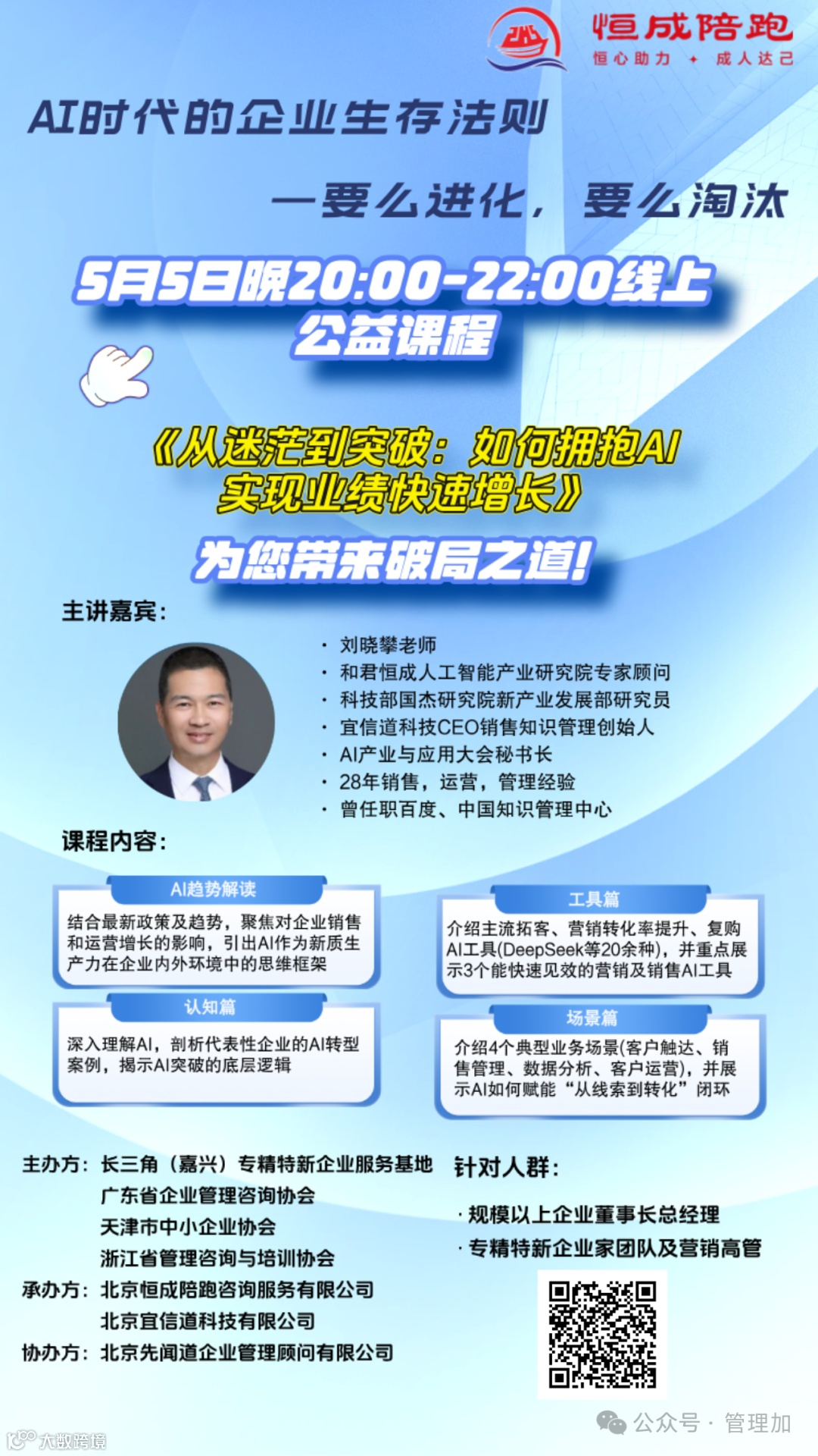 《从迷茫到突破:如何拥抱AI实现业绩快速增长》主题分享,由长三角(嘉兴)专精特新企业服务基地、广东省企业管理咨询协会、天津市中小企业协会、浙江省管理咨询与培训协会联合主办,恒成陪跑承办的《从迷茫到突破:如何拥抱AI实现业绩快速增长》公益大课,将于5月5日20-22点,携手北京恒成人工智能研究院顾问、营销专家刘晓攀老师,为您线上答疑解惑。