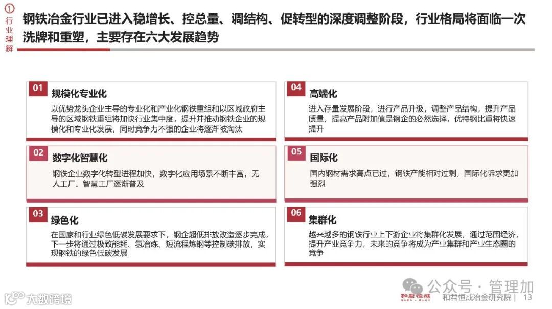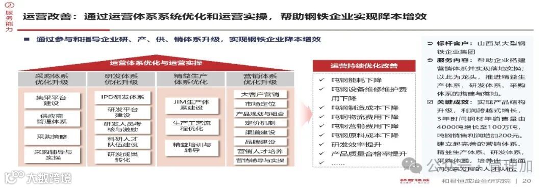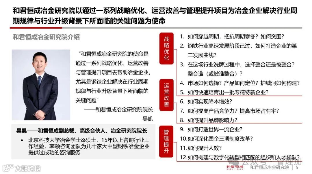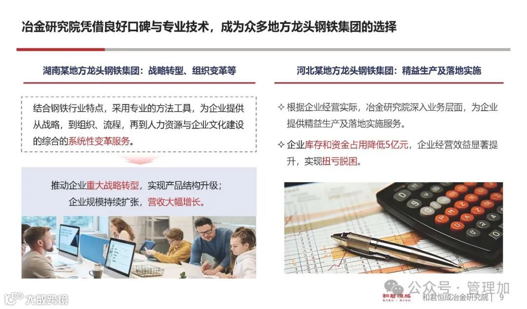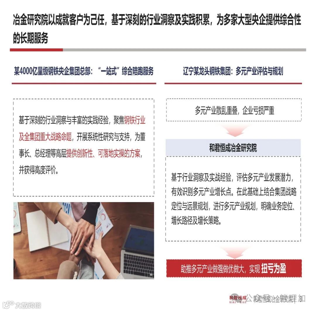 管理加如何让您的冶金企业在行业波动中稳健前行,实现突破性增长?和君恒成冶金研究院凭借深厚的行业知识和实战经验,为你开启变革的步伐。解决钢铁企业面临的行业周期和升级问题,助力企业穿越周期、降本增效。