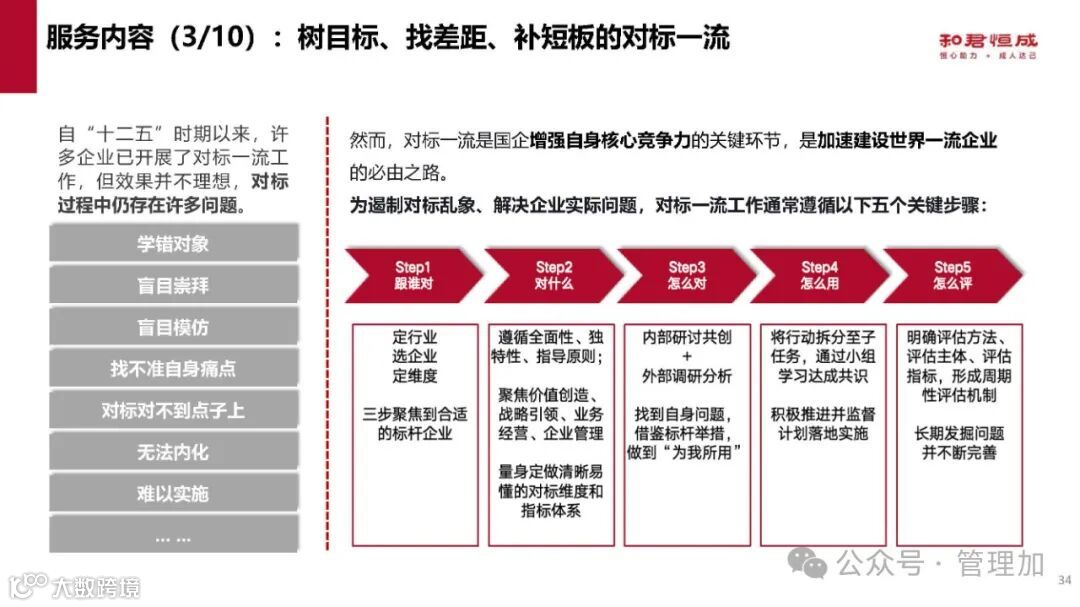 价值创造行动聚焦七大领域,为国资央企指明未来两至三年重点工作方向。七大聚焦实现价值创造有具体要求和主要工作任务,如打造指标体系、加强产学研融合、强化主体作用等。和君恒成认为国资央企未来要从对标一流出发,在六个方面瞄准世界壹流企业和行业先进企业。