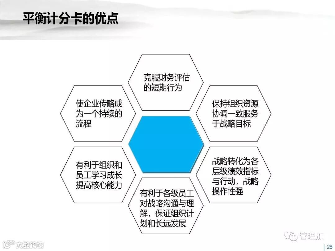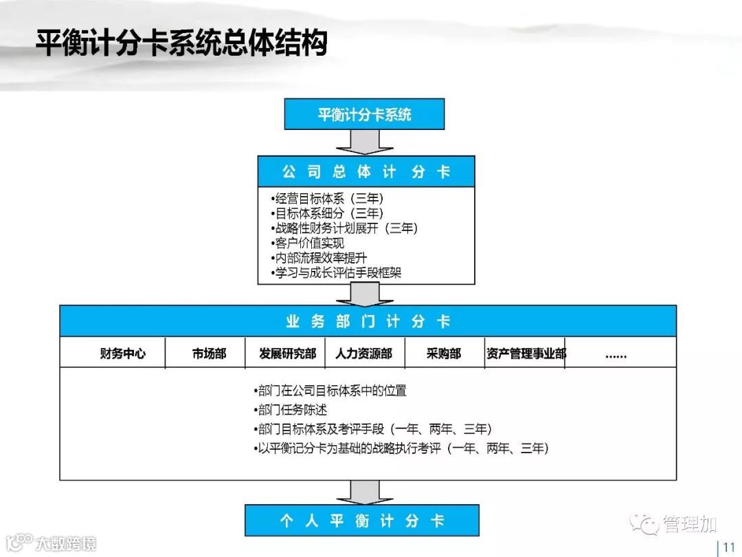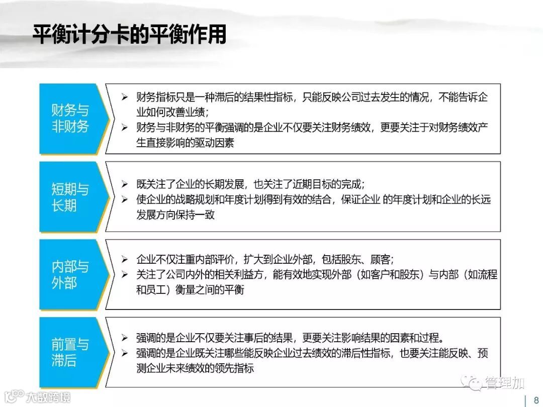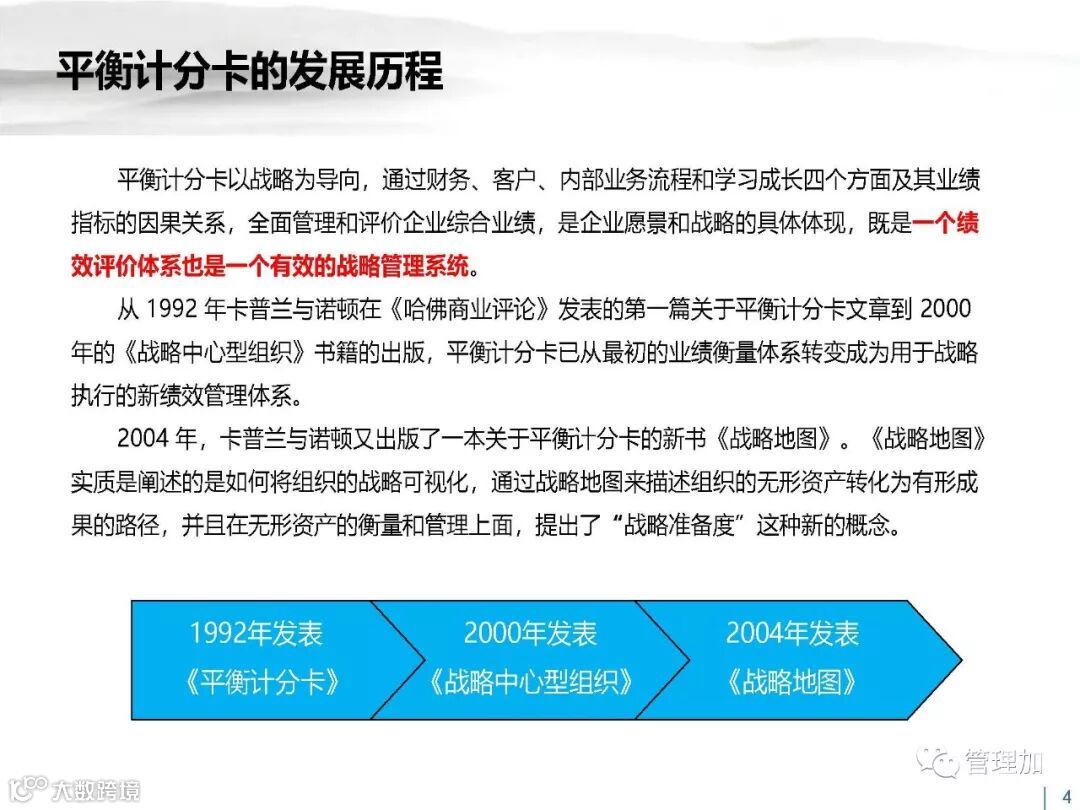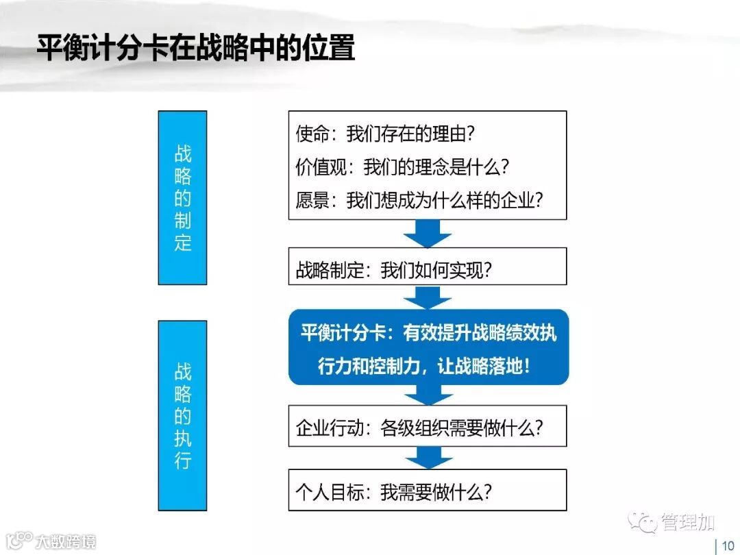平衡计分卡于20世纪90年代初,由哈佛商学院的罗伯特·卡普兰(Robert Kaplan)和诺朗诺顿研究所所长(Nolan Norton Institute)、美国复兴全球战略集团创始人兼总裁戴维·诺顿(David Norton)所从事的“未来组织绩效衡量方法”一种绩效评价体系。宗旨是帮助企业中高层就企业的使命、愿景、长中短期目标、战略行动达成一致,并且作为一种沟通工具,使各个职能部门及其管理人员更加明确自己在企业经营发展中的权责,确保战略得以实施。因此,我们对平衡计分卡的借鉴,不应该只将它作为一种改进的具体评价方法,更重要的是形成一种新的理念,把业绩评价提高到战略的高度来认识,建立战略性的业绩评价体系。