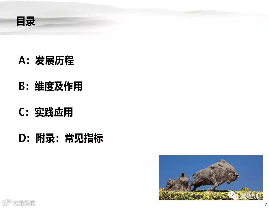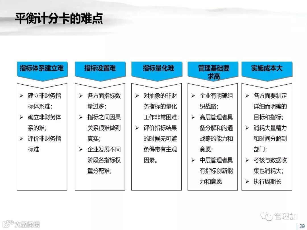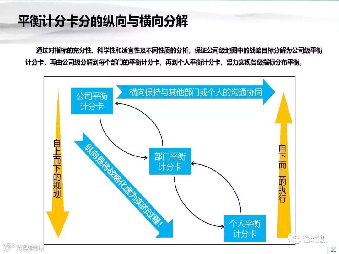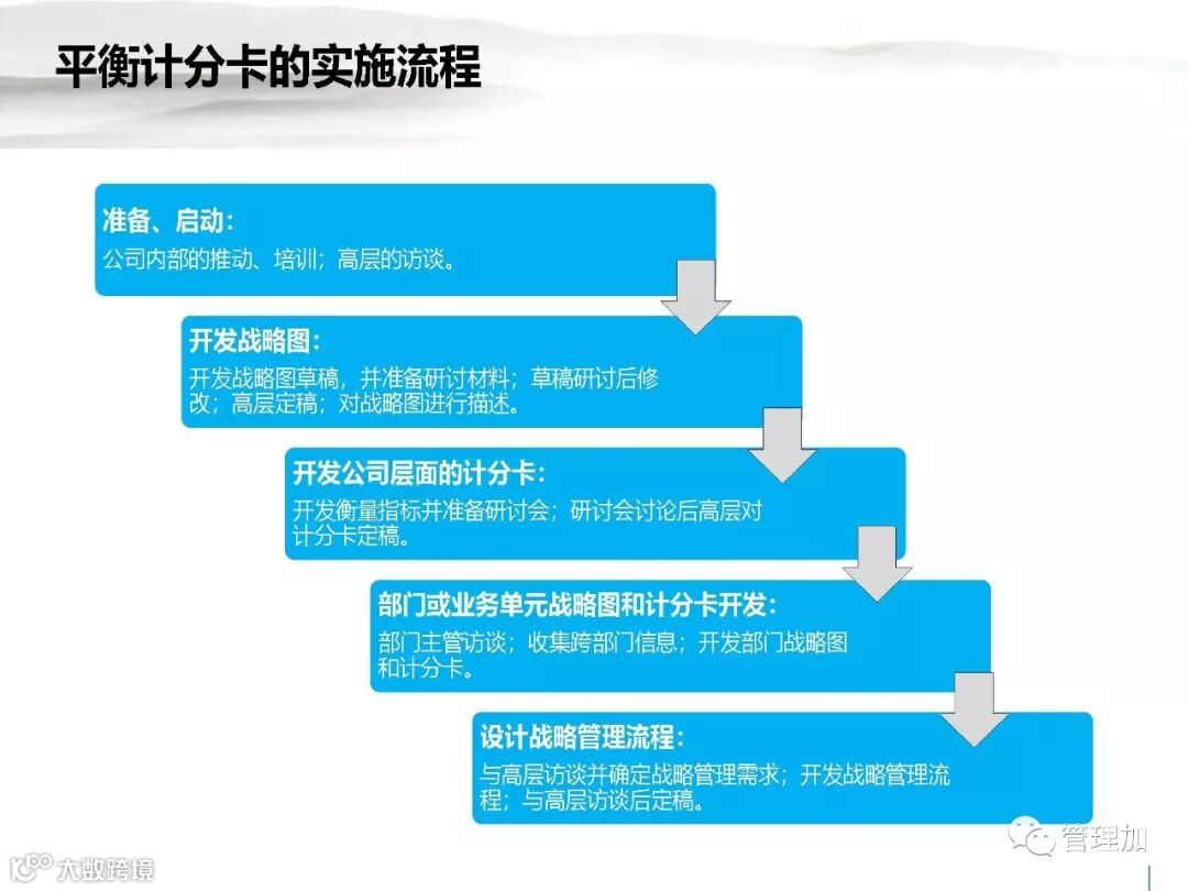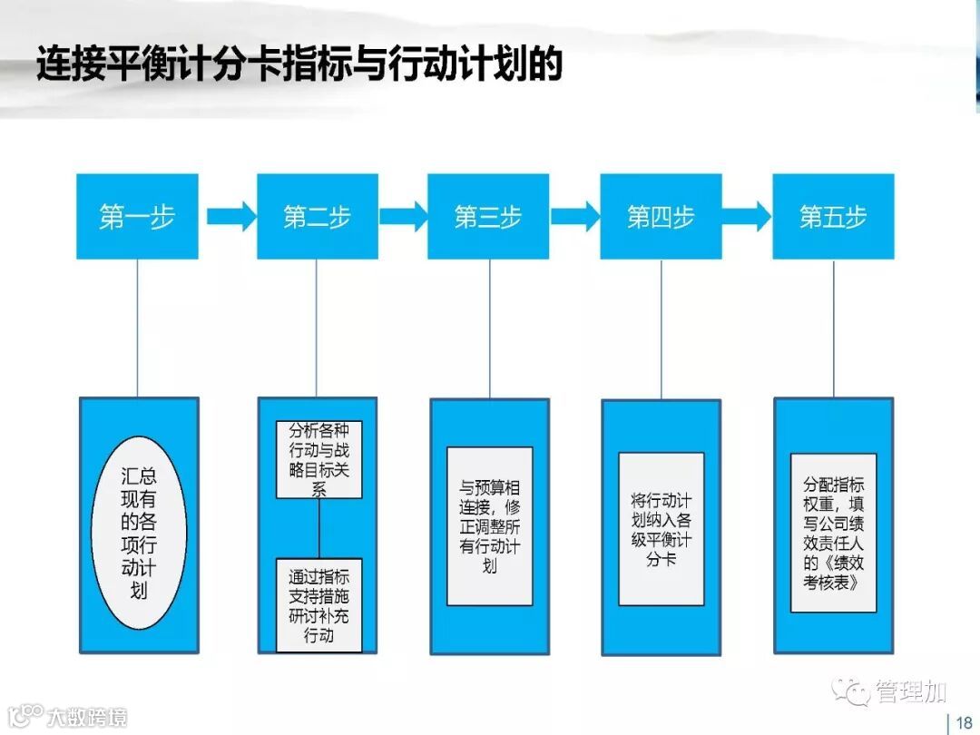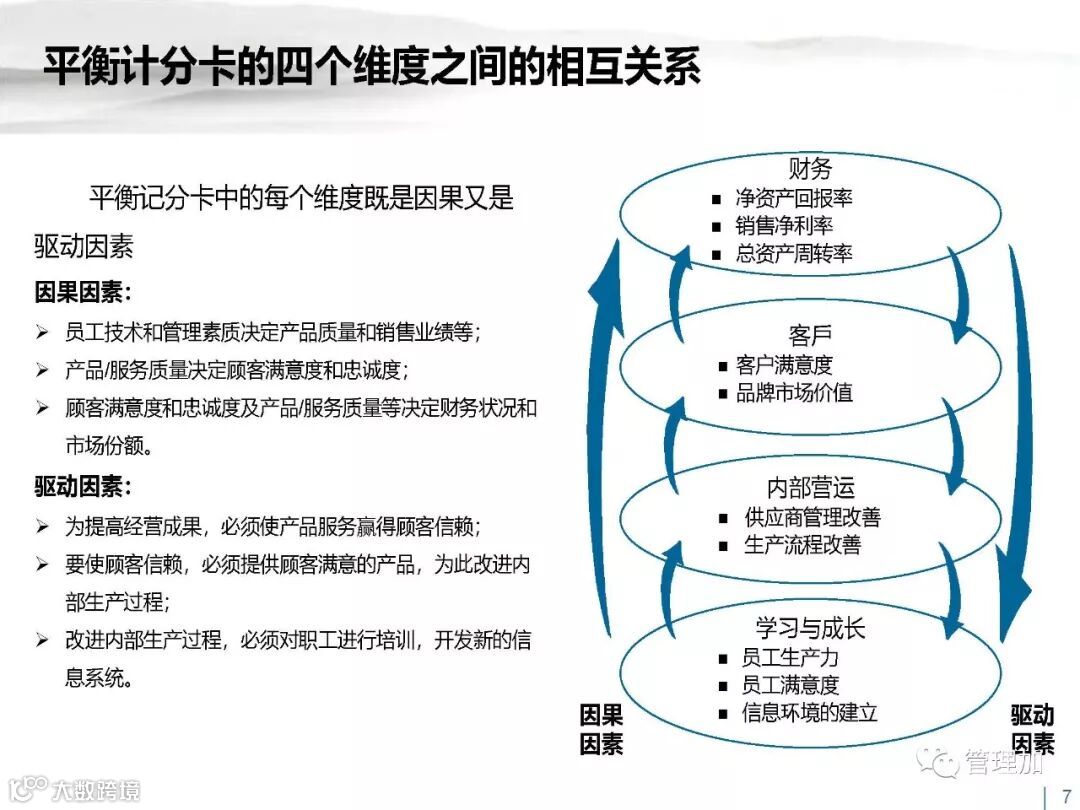 平衡计分卡于20世纪90年代初,由哈佛商学院的罗伯特·卡普兰(Robert Kaplan)和诺朗诺顿研究所所长(Nolan Norton Institute)、美国复兴全球战略集团创始人兼总裁戴维·诺顿(David Norton)所从事的“未来组织绩效衡量方法”一种绩效评价体系。宗旨是帮助企业中高层就企业的使命、愿景、长中短期目标、战略行动达成一致,并且作为一种沟通工具,使各个职能部门及其管理人员更加明确自己在企业经营发展中的权责,确保战略得以实施。因此,我们对平衡计分卡的借鉴,不应该只将它作为一种改进的具体评价方法,更重要的是形成一种新的理念,把业绩评价提高到战略的高度来认识,建立战略性的业绩评价体系。